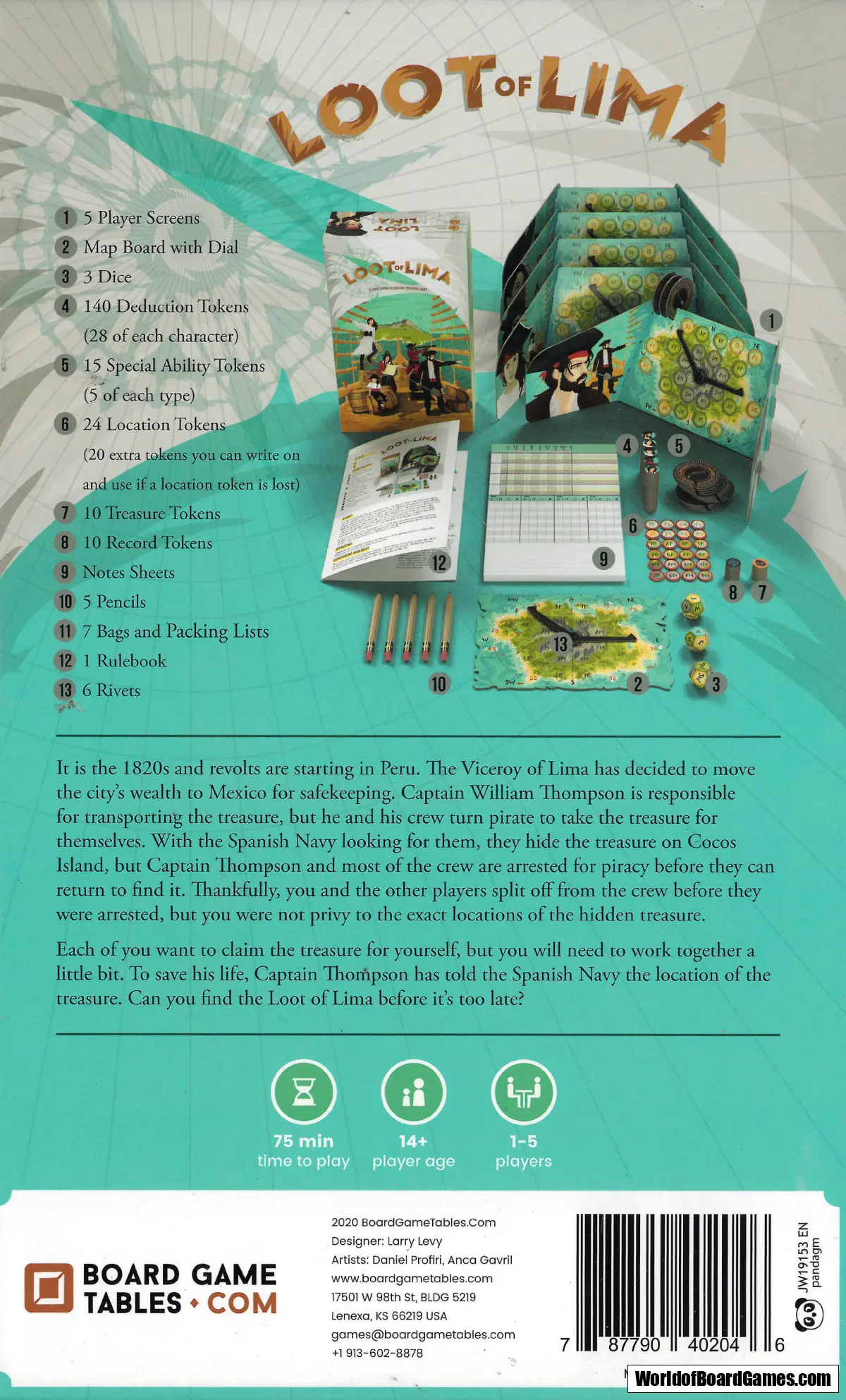 Each turn, you roll dice, form questions using coordinates, and interrogate your fellow treasure hunters to gain clues. But the real challenge lies in connecting fragments of information. Your notebook becomes your treasure map, and deduction is your greatest weapon. With elegant mechanics, intense player interaction, and a satisfying logic puzzle at its heart, Loot of Lima is a thrilling race to uncover the ultimate prize before your opponents do.