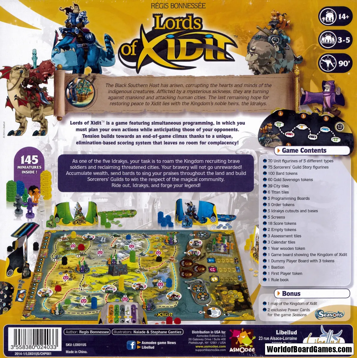 70 figurines; 75 guild stories; 60 sovereigns; 100 bard tokens; 3 assessment tiles; 1 game board; 1 dummy board and 3 dummy tokens; 39 city tiles; 1 bastion; 1 year token; 2 empty tokens; 18 score tokens; 5 order tokens; 1 first player token; 6 titan tiles; 5 screens; 3 calendar tiles; 5 programming boards; 5 idrakys tokens.