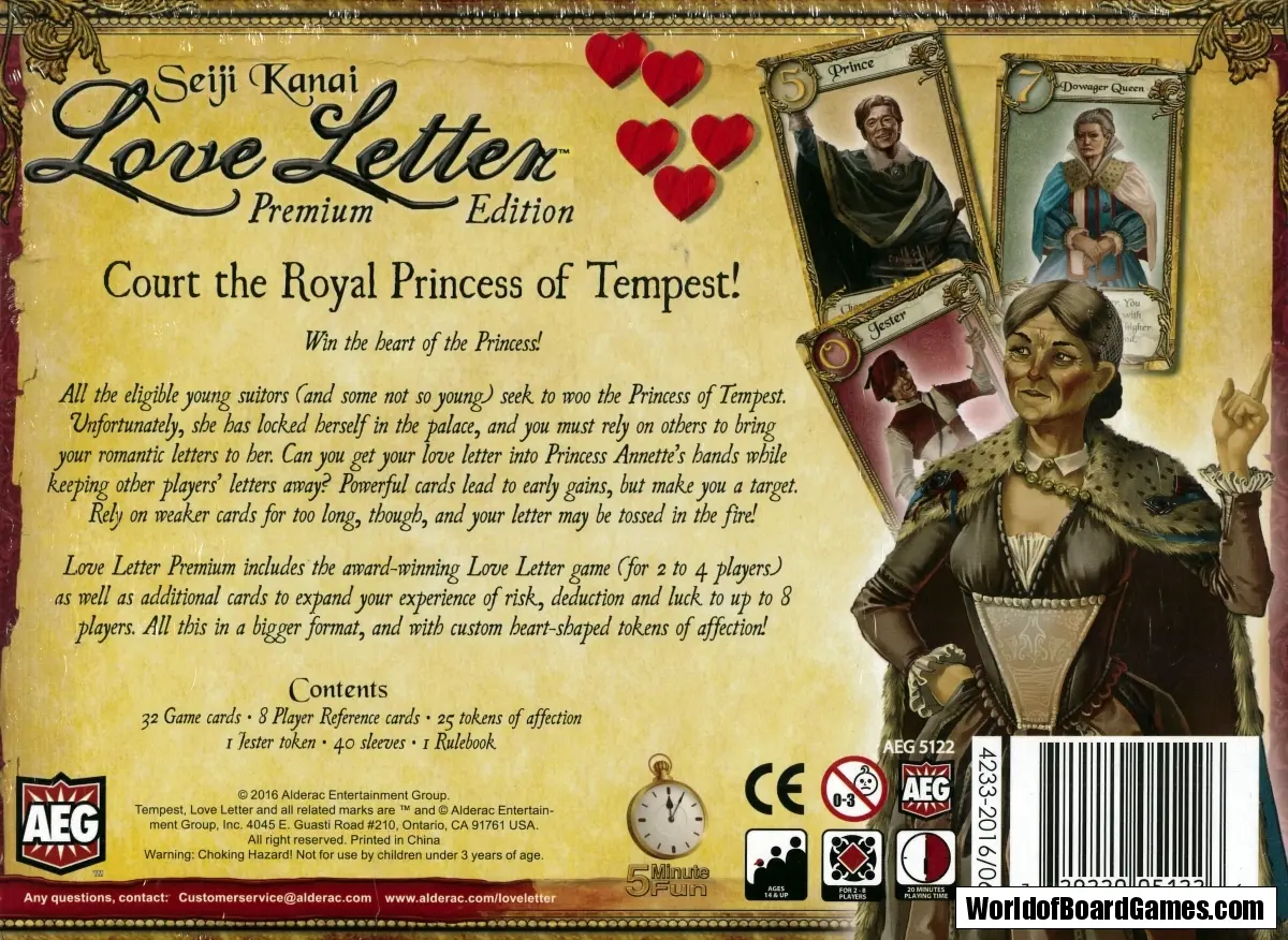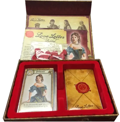 Love Letter Premium is designed for the person who loves Love Letter. It is presented in a deluxe box with a magnetic clasp featuring a special red velvet tray for storage. Inside you’ll find tarot-sized cards and sleeves for both the classic Love Letter card set and an all new extension to the game that enables play for up to 8 players. Special heart-shaped Affection Tokens are also included.