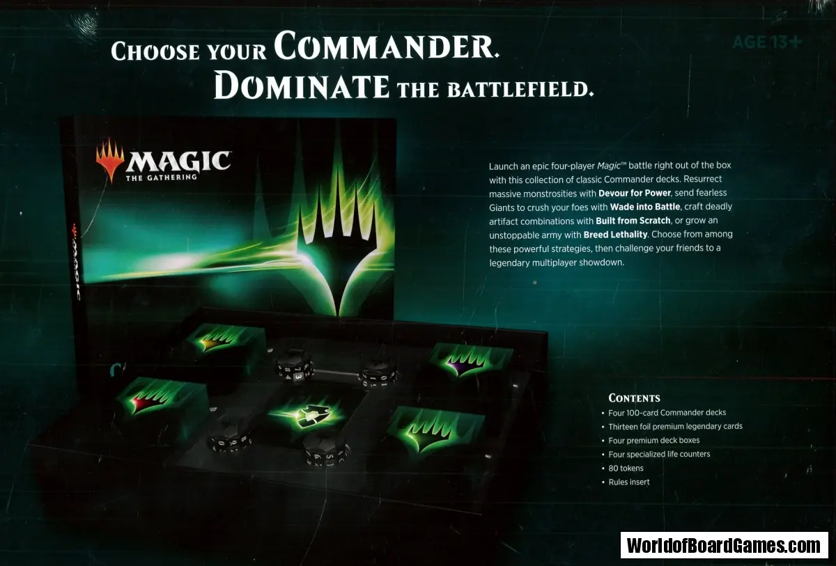 Launch a legendary four-player Magic™ battle right out of the box with this collection of classic Commander decks. Create massive undead monstrosities with Devour for Power, send fearless Giants to crush your foes with Wade into Battle, craft deadly artifact combinations with Built from Scratch, or spawn an inexorably growing army with Breed Lethality. Choose from among these powerful strategies, then challenge your friends to an epic multiplayer showdown.