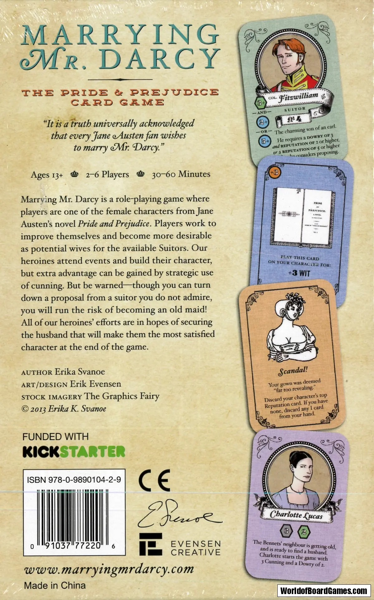 It is a truth universally acknowledged, that lovers of Pride and Prejudice want to marry Mr. Darcy. Marrying Mr. Darcy is a strategy card game where players are one of the female characters from Jane Austen’s novel Pride and Prejudice. Players work to improve themselves and attract the attention of the available Suitors. The ladies do this by attending Events and improving their Characters, but advantage can be gained by the use of Cunning. All of their efforts are in hopes of marrying well and becoming the most satisfied character at the end of the game!