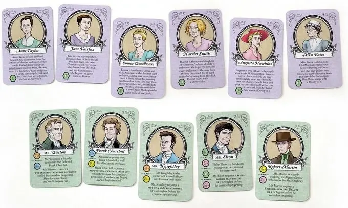 The Emma Expansion includes 6 new Heroines, 5 new suitors, and 60 new Event cards inspired by Jane Austen's "Emma." Just replace your Marrying Mr. Darcy Heroine, Suitor, and Event cards with the new Emma Expansion and you are all set to play! You'll enjoy new Emma appropriate activities such as Blunders, Interference, Gossip, and Revelations. Additionally, each new playable Heroine features a new "lady power" for variation in gameplay every time!