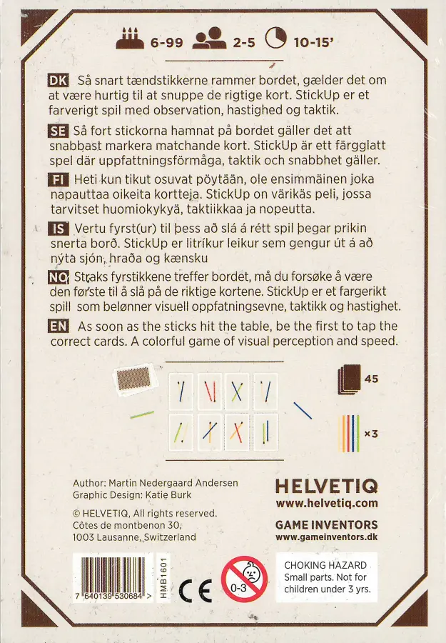Så fort stickorna hamnat på bordet gäller det att snabbast markera matchande kort. StickUp är ett färgglatt spel där uppfattningsförmåga, taktik och snabbhet gäller.