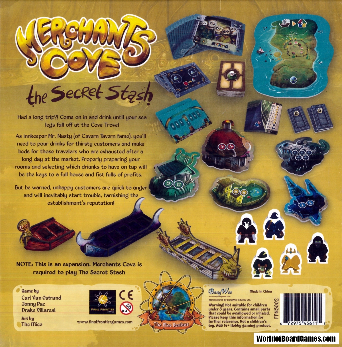 The Secret Stash is a treasure trove of goodies that can be added to Merchants Cove. It features a variety of modular expansions you can mix and match to create fresh experiences. It also introduces new content for playing solo: a book of 12 thematically-driven scenarios, and a deck of solo challenge cards.
