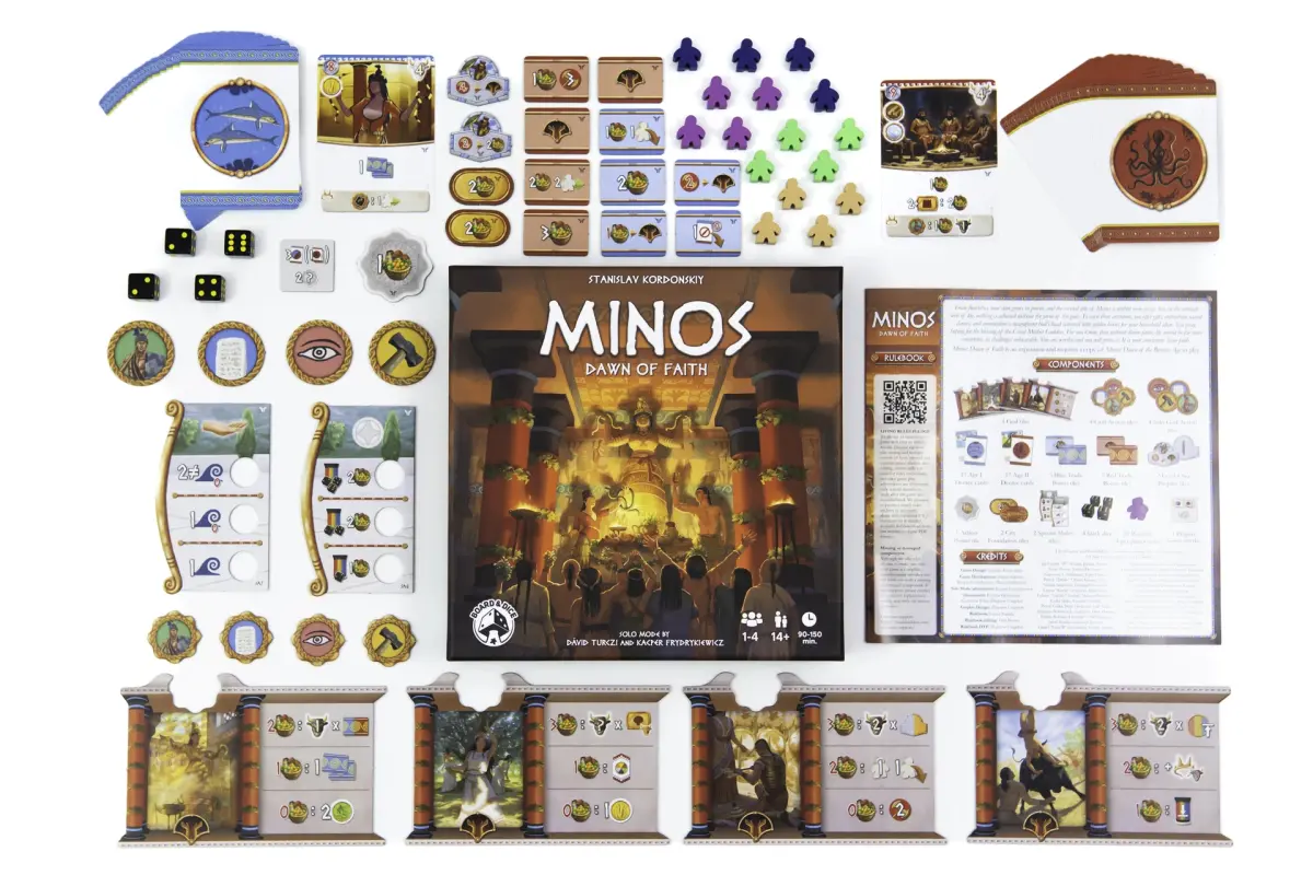 Step into the sacred rituals of ancient Crete with Minos: Dawn of Faith, the official expansion to Minos: Dawn of the Bronze Age. As your clan ascends in influence, the path to true power now lies in divine favor. Offer sacred gifts, perform ceremonial dances, and adorn your household with golden bull-headed idols in hopes of earning blessings from the Great Mother Goddess.