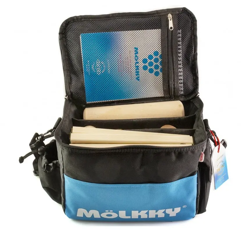 En praktisk kvalitets Mölkky-väska, som innehåller allt du behöver för ett spännande parti av det populära utomhusspelet Mölkky! Väskan är utformad i hållbart material för utomhusbruk, praktiskt utformad för Mölkky, och med vadderat axelband för bästa komfort. Väskan innehåller alla komponenter till spelet i klassiskt trä, och med käglor i "turnerings"-storlek.