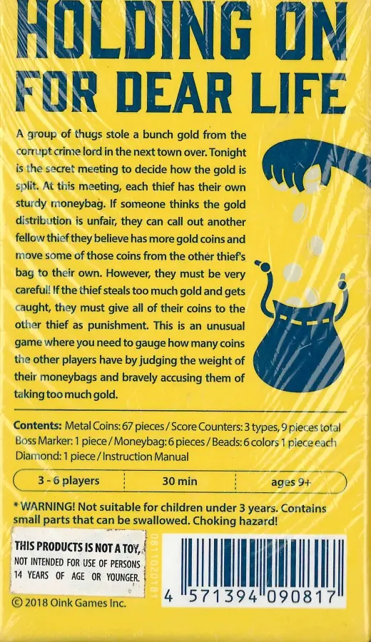A group of thugs stole a bunch gold from the corrupt crime lord in the next town over. Tonight is the secret meeting to decide how the gold is split. At this meeting, each thief has their own sturdy moneybag. If someone thinks the gold distribution is unfair, they can call out another fellow thief they believe has more gold coins and move some of those coins from the other thief's bag to their own. However, they must be very careful! If the thief steals too much gold and gets caught, they must give all of their coins to the other thief as punishment. This is an unusual game where you need to gauge how many coins the other players have by judging the weight of their moneybags and bravely accusing them of taking too much gold.