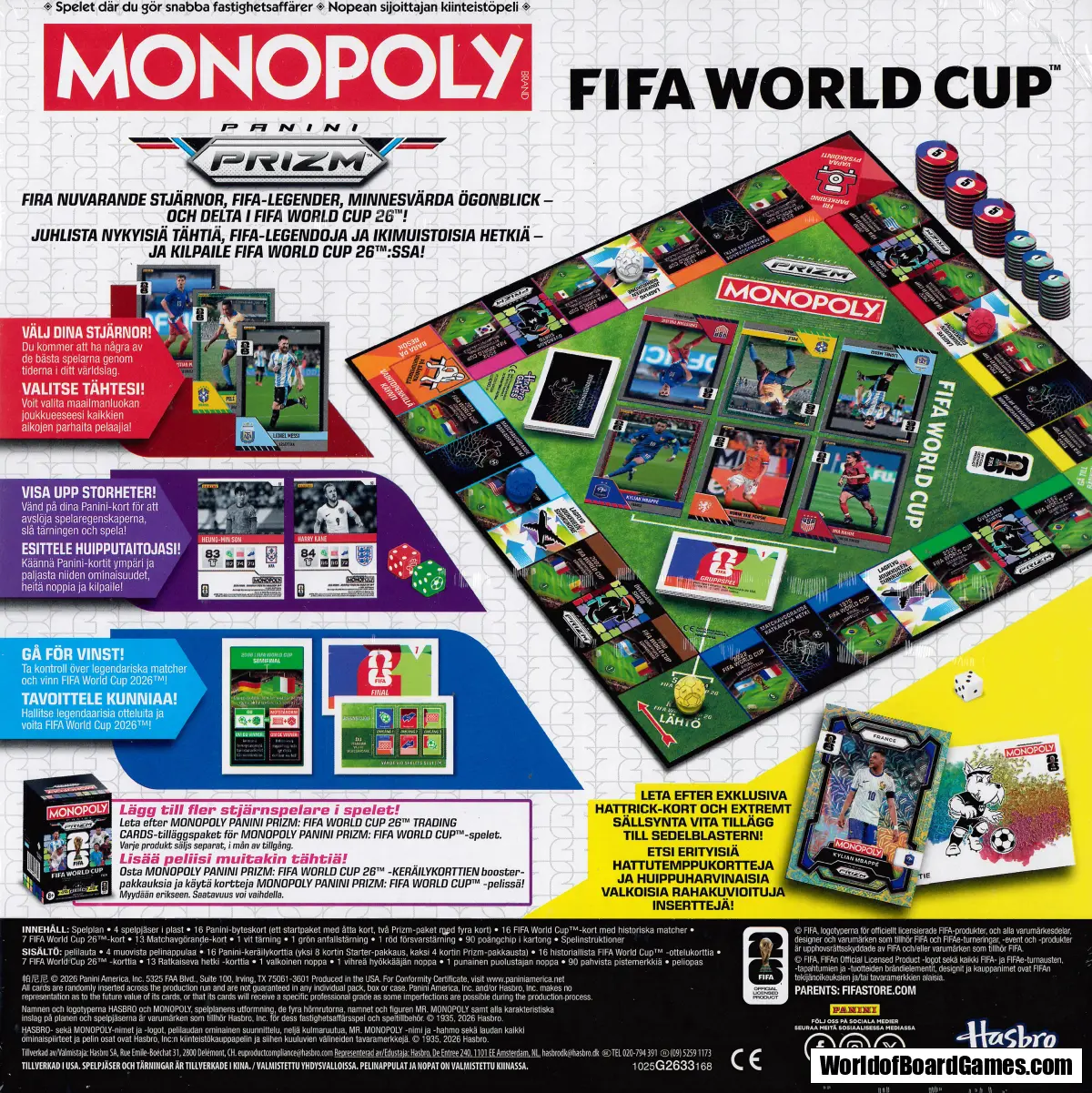 I den här versionen av Monopoly-spelet väljer du fotbollsstjärnor på Panini-kort och bygger ett lag i världsklass. Flytta sedan runt på spelplanen och ta kontroll över så många historiska FIFA World Cup-matcher som möjligt. Tävla om poäng från motståndare som hamnar på matcherna genom att jämföra statistik på Panini-korten och slå med specialtärningen. Tjäna mer poäng genom att slå motståndare i matchavgörande utmaningar och tävla i FIFA World Cup 2026! Spelaren som har flest poäng när spelet är slut vinner.