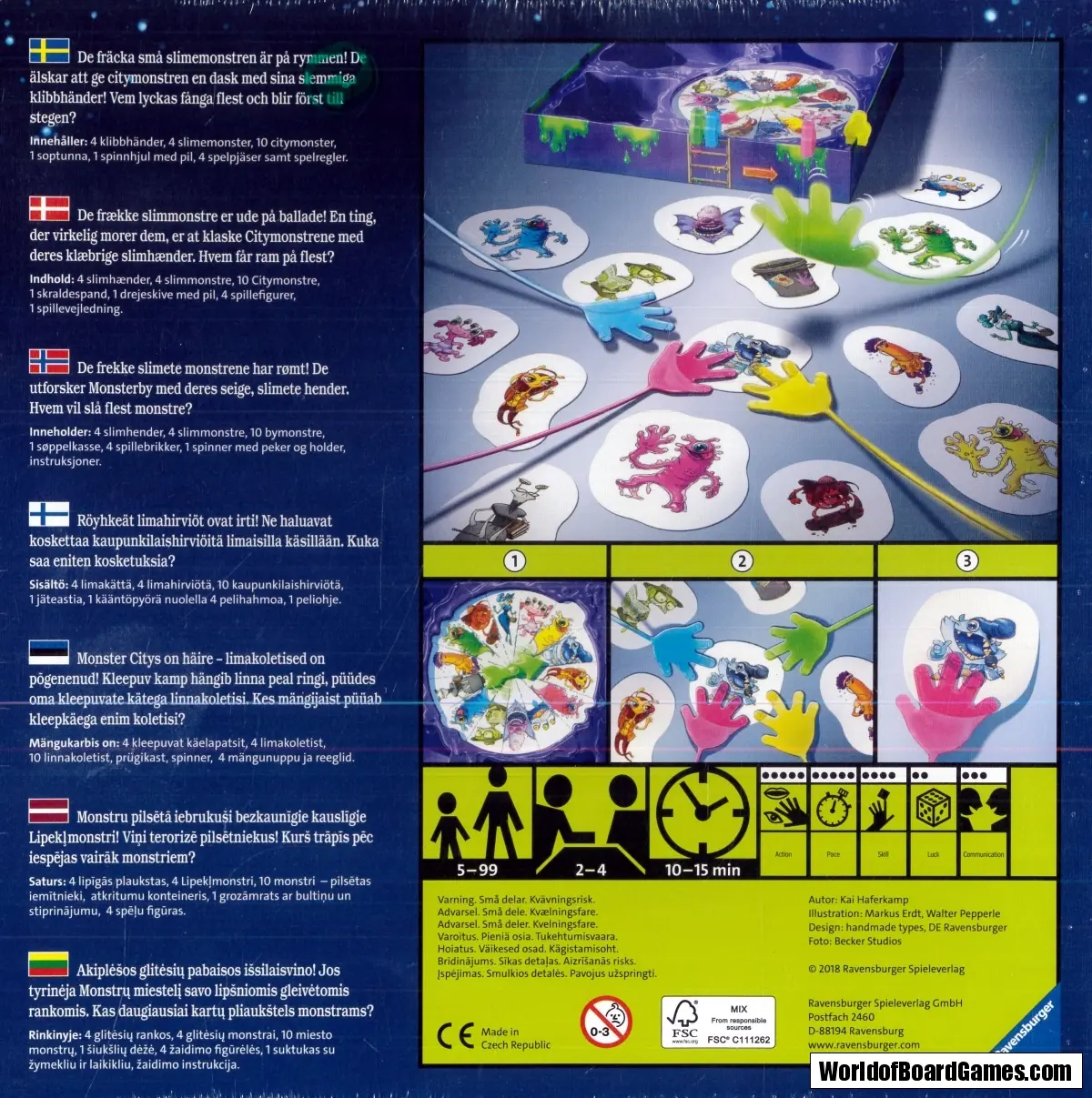 Innehåller: 4 klibbhänder, 4 slimemonster, 10 citymonster, 1 soptunna, 1 spinnhjul med pil, 4 spelpjäser samt spelregler