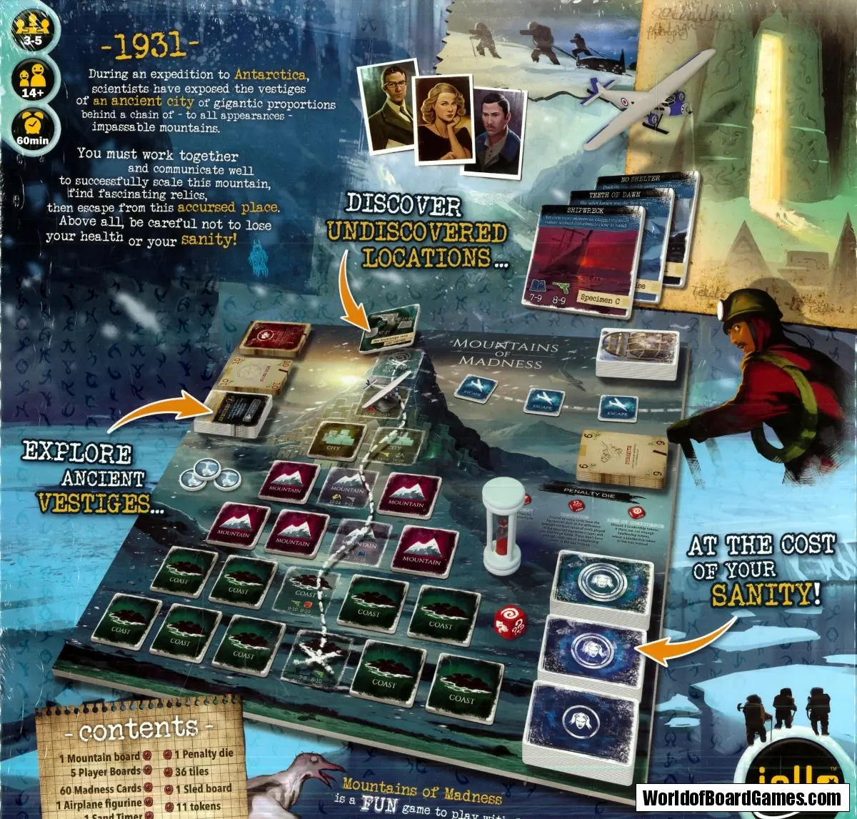 As members of this strange expedition, you will face challenges whose horror you cannot fully comprehend. By using the equipment on your cards, you must work together to overcome these horrifying challenges. Do your best, since time matters! Each challenge overcome makes the road to victory easier, but if—despite your best efforts—you do not succeed, you will suffer injuries or even lose your sanity. The closer you get to the summit, the greater your madness will become. And as madness seizes each member of your team, it becomes that much harder to communicate with each other, as you head towards your inevitable demise...