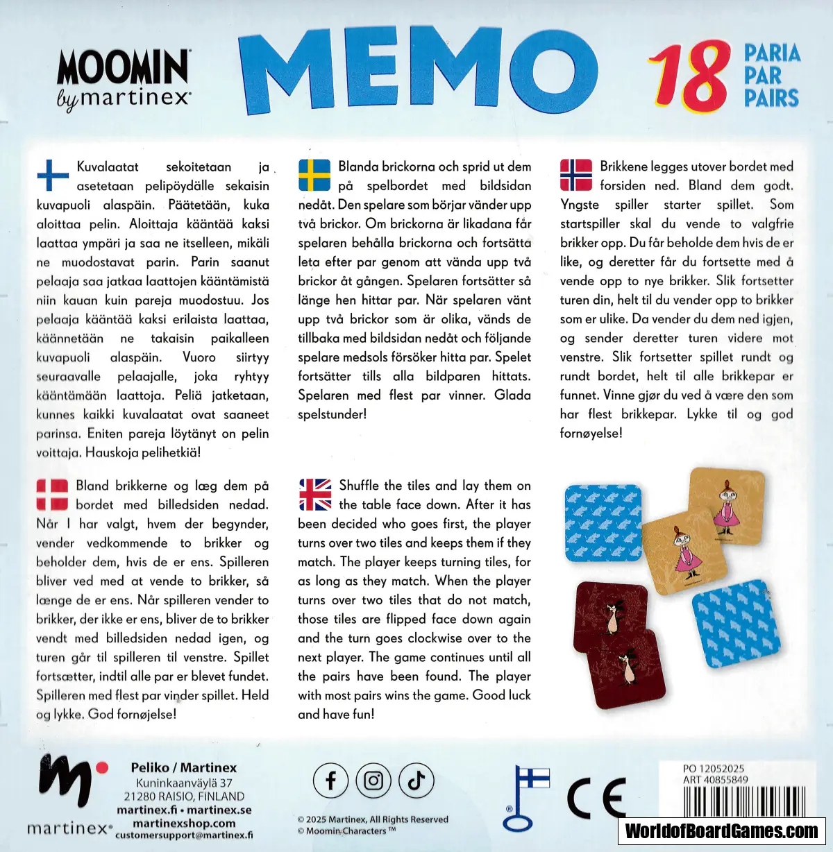 Ett klassiskt memoryspel med 18 par brickor med roliga muminmotiv på färgglada bakgrunder. Om du hittar ett matchande par får du behålla det och fortsätta leta. När spelet är slut vinner spelaren med flest brickor.