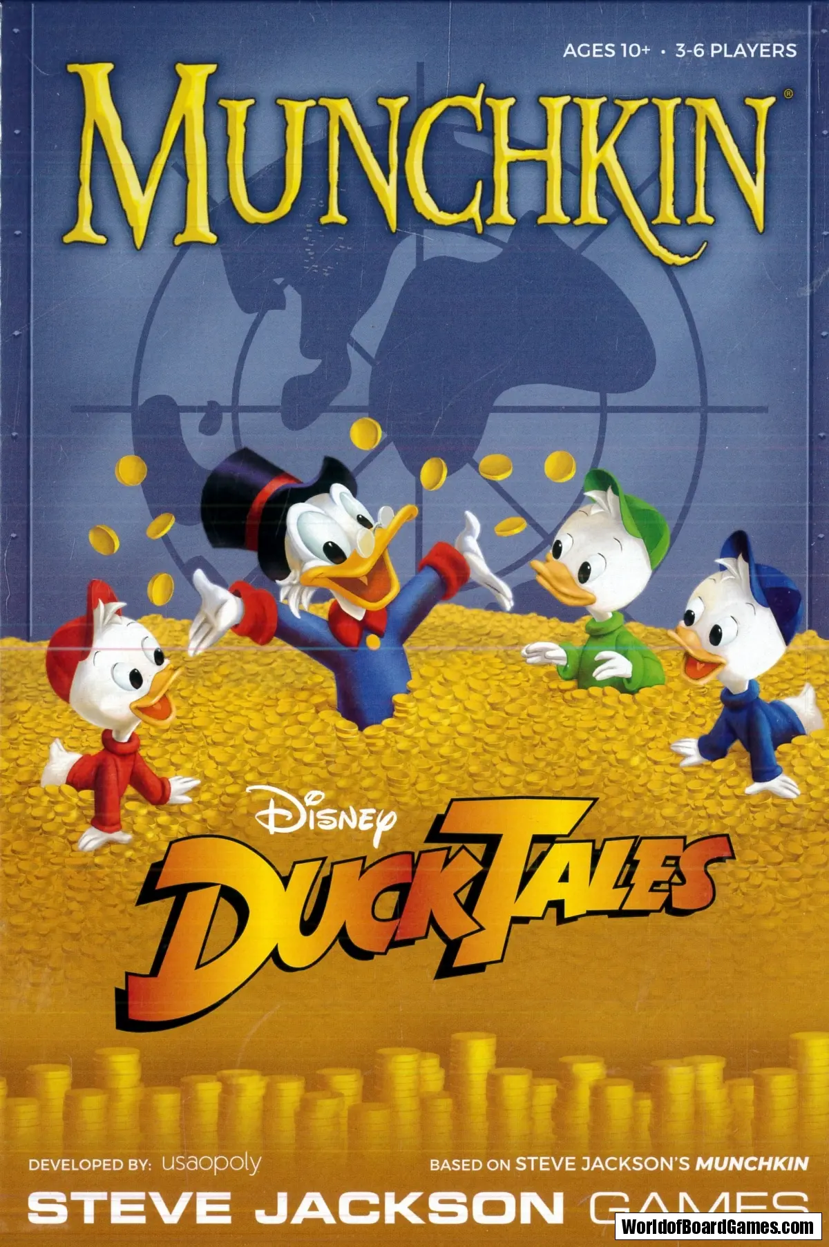 In Munchkin: Disney DuckTales, players can choose to play Scrooge McDuck, Huey, Dewey, Louie, and other DuckTales icons to battle it out against monsters (and each other) while uncovering treasure that will have them swimming in gold – just like "Unca Scrooge"! True to the original Munchkin game, your goal is to collect as much Treasure as possible while enlisting the help of interesting Items and Allies you’ll come across during your adventures. If you’re the first to reach Level 10, you win! However, watch out for conniving villains such as Bigtime Beagle or Curses that could distract you from becoming filthy rich.
