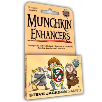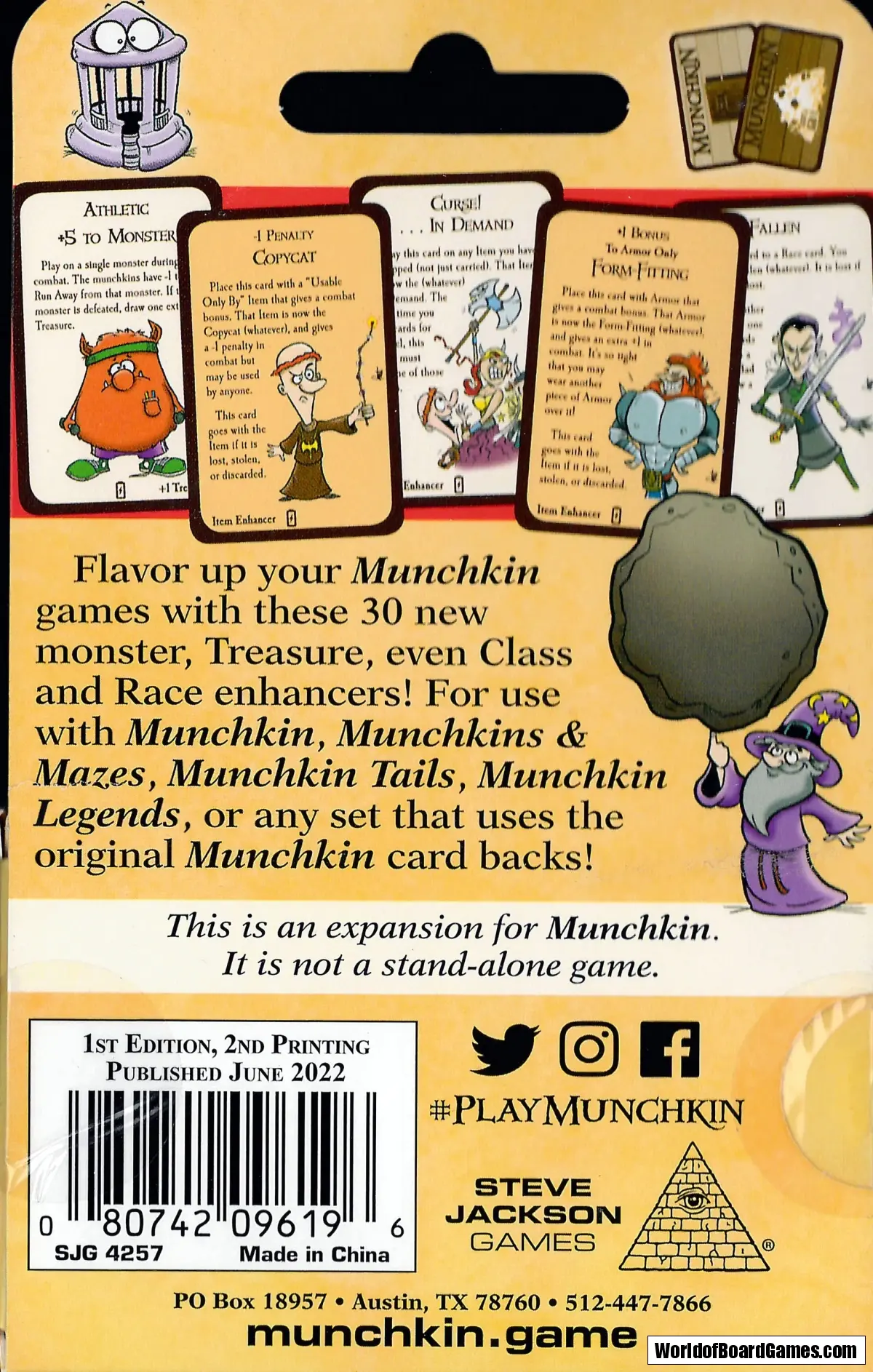 Flavor up your Munchkin experience with these 30 new monster, Treasure, Class, and Race enhancers! Enhancers boost the strength of Items, monsters, and the munchkins themselves, but beware! Your foes can turn them against you as well. Munchkin Enhancers adds more power, more challenge, and more backstabbing fun to your games!