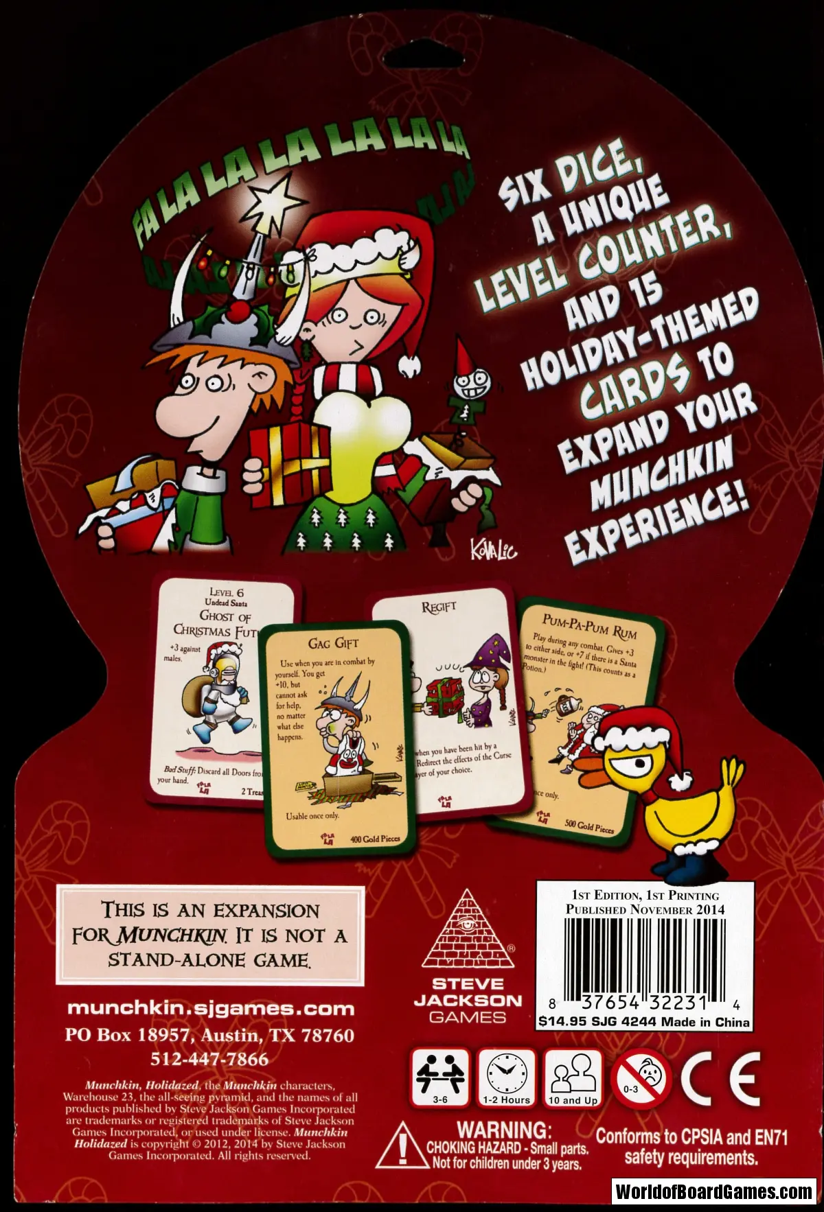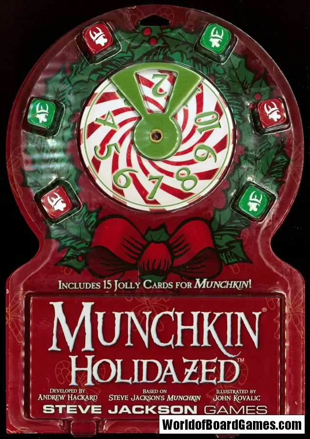 Holidazed pack combining eleven new cards with four reprints from the hard-to-find Munchkin Holiday Surprise, a candy-themed Level counter, and six red-and-green festive 14mm dice! Not included: gratuitous exclamation points!!!!!