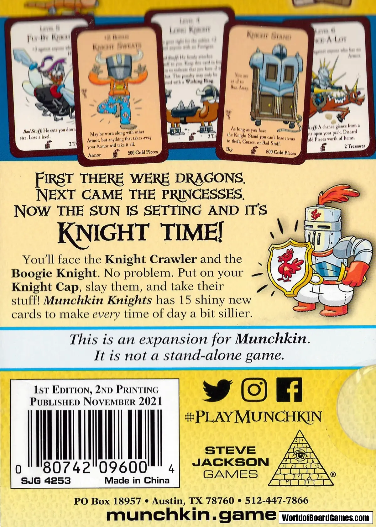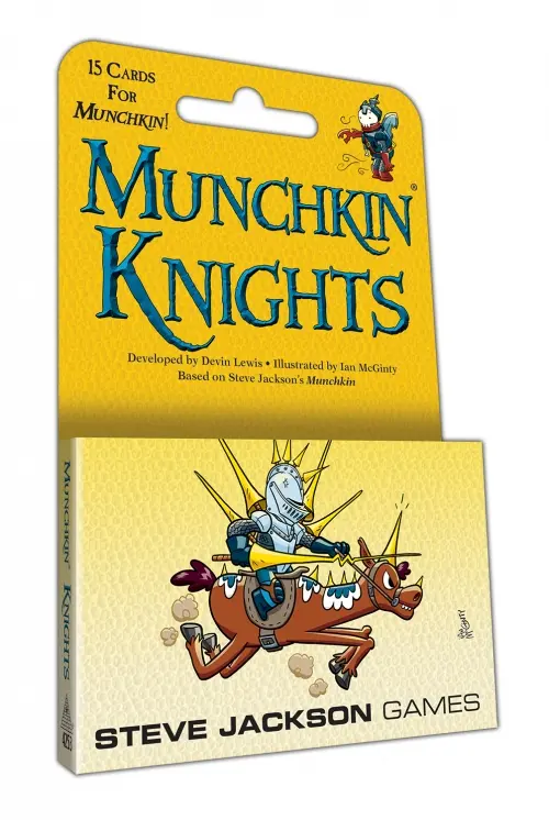 In times of yore, loyal knights would ride out to do their king's bidding. These knights have stumbled into the dungeon and are now in your way. Draw your steel and show them who's the king around here. Munchkin Knights has 15 shiny new cards to add some Knight to your day!