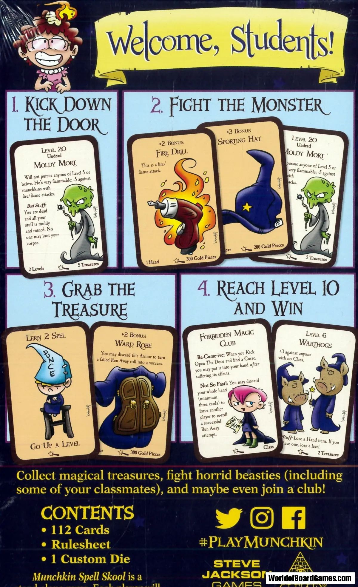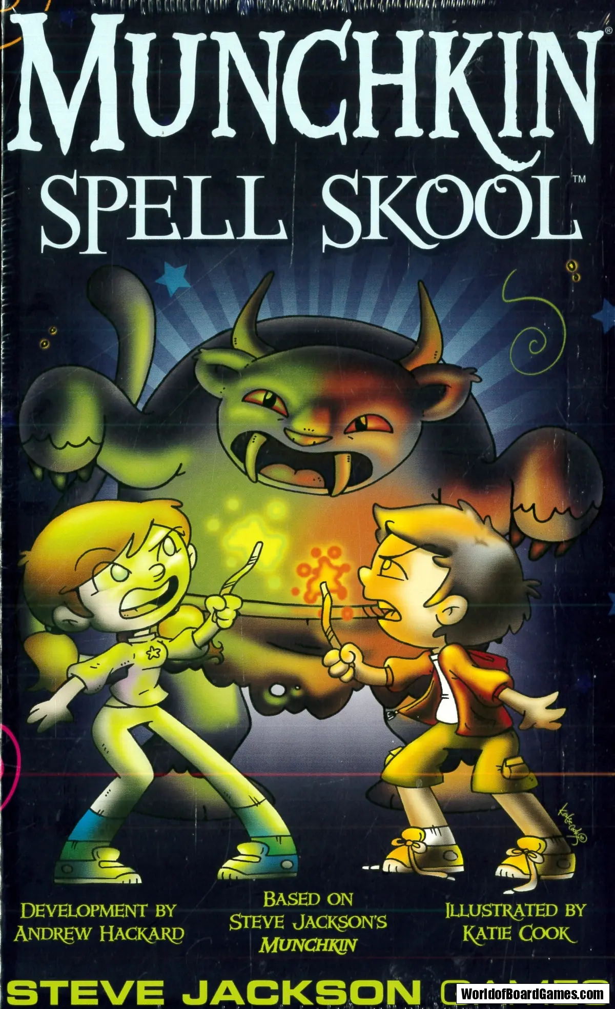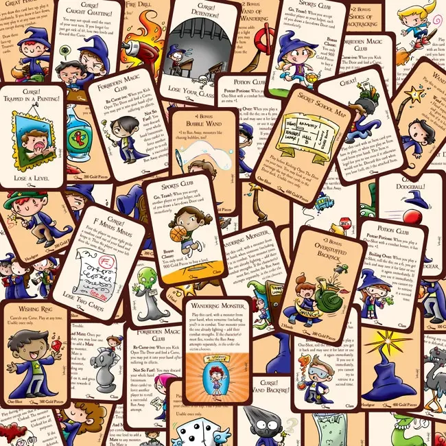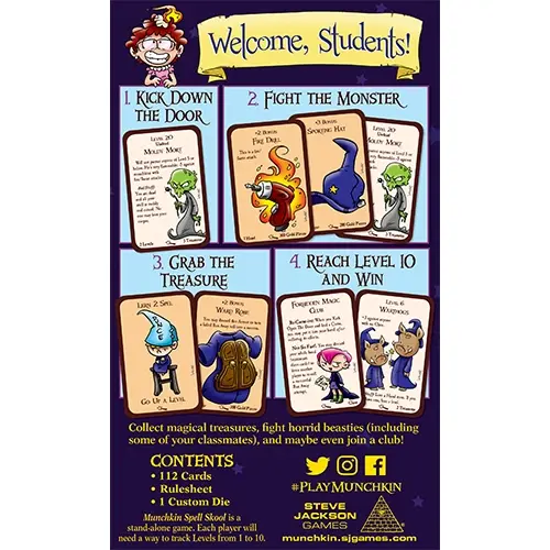 The art in Munchkin Spell Skool is adorable, but you've still got to slay the monsters, steal the treasure, and reach Level 10 to win! This is a stand-alone game, and shuffles well into any other Munchkin game.
