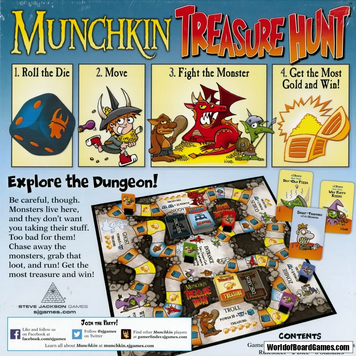Munchkin Treasure Hunt is a fun boardgame for up to six players, ages 6 and up – now everyone in the family can be a Munchkin! (Don't worry . . . you don't need to know how to play any other Munchkin game to enjoy Treasure Hunt.) Treasure Hunt comes with a board, two custom six-sided dice, 96 colorful cards, four blank cards (so you can write your own!), six character standies, and a rulesheet.