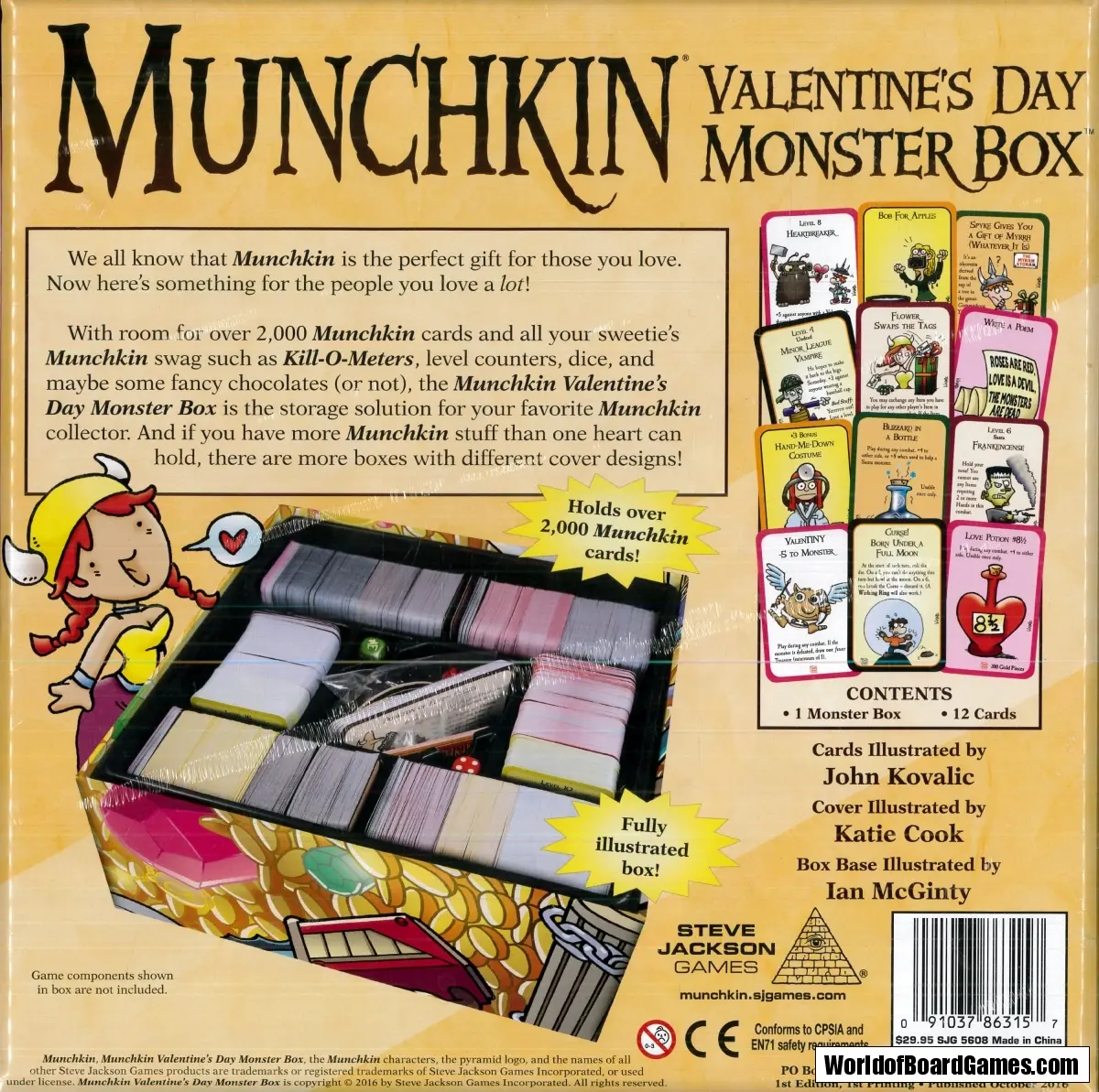 Do you and your sweetheart have lots of Munchkin stuff? Do you want a way to bring it on your romantic picnic? Then this Monster Box holds the answer to all your heart's desires! You'll have room to lovingly care for more than 2,000 Munchkin cards, a Level Playing Field, some Seals and Dungeons, and all your other alluring Munchkin swag – all with adorable art by Katie Cook.
