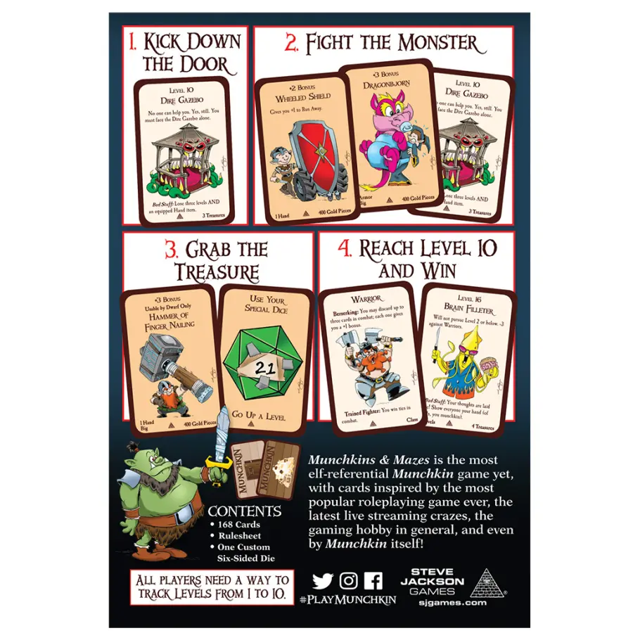 Munchkin is back in a whole new addition! Munchkins & Mazes is the most elf-referential Munchkin game yet, with cards inspired by the most popular roleplaying game ever, the latest live streaming crazes, the gaming hobby in general, and even by Munchkin itself! We've updated some of our favorite cards and created a whole lot of new ones in this set that's sure to please anyone who's ever rolled a 20-sided die.