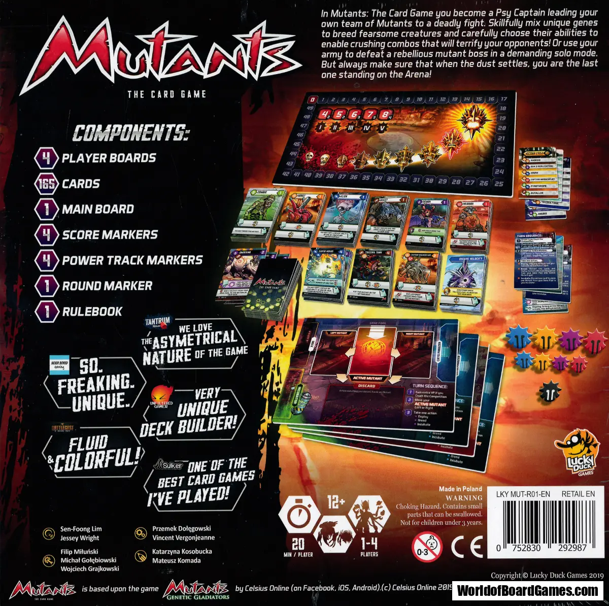 In Mutants, 1-4 players have to mix and match genetics to create the ultimate warriors and demonstrate their prowess in the arena. By dominating the arena and freezing the most valuable mutants, you gain Victory Points — and whoever gets most of them wins.