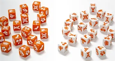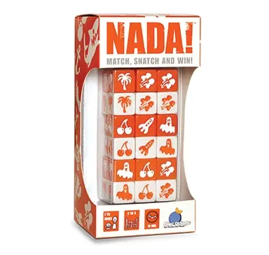 There is always a match until…Nada! Scoop up the dice and let ‘em roll. Quick—scan the array for matching symbols between the orange and white dice. The first to call a match collects all the dice showing that symbol. No matches? No problem! It’s another chance to win. Shout “Nada!” to snatch up all the dice. But speak too soon and you’ll pay the price. This dice game has 3 play variations. Think sharp and act fast to match, snatch, and win!