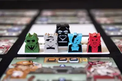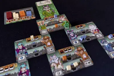 Neko Syndicate is a "Thinky-filler" by Dani García, featuring an innovative tableau building mechanic where cards are both the actions and the goals to achieve: fast set-up, simultaneous play, low interaction and brain burner in a 30 minutes easy to play hard to master beautiful game.