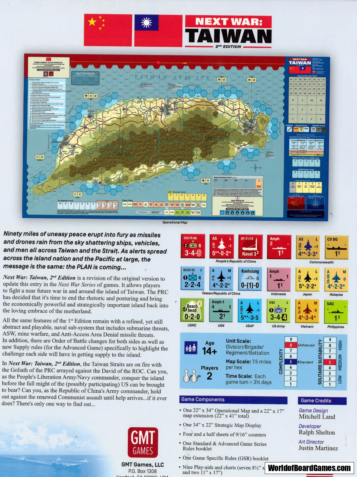 Next War: Taiwan, the next volume in GMT's series of Next War games and the follow-on to Next War: Korea, allows players to fight a near future war in and around the island of Taiwan. In this sequel, the communist state of China, the PRC, has decided that its time to end the rhetoric and posturing and bring the breakaway republic back into the Socialist Harmonious Society.