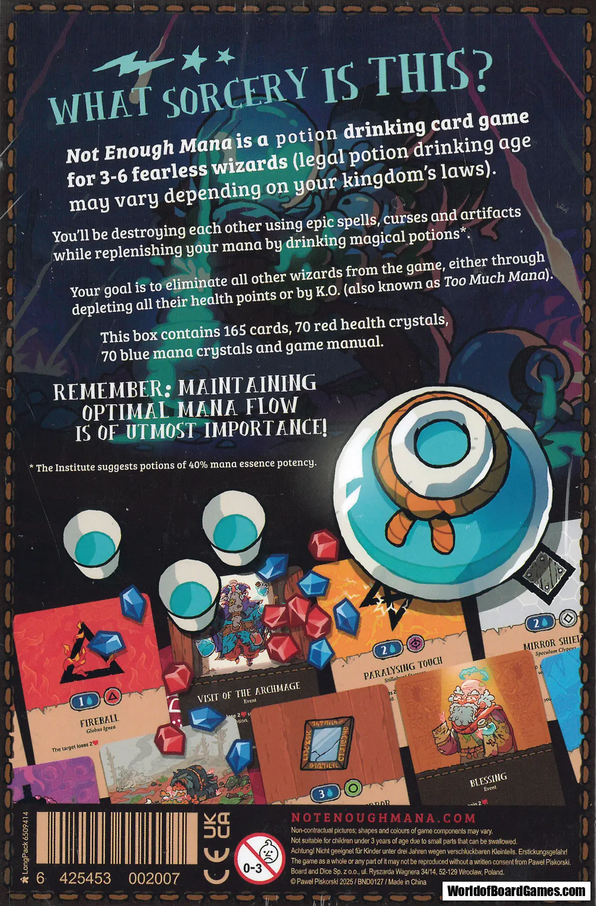 Not Enough Mana is a "potion" drinking card game for 3-6 fearless wizards (legal potion drinking age may vary depending on your kingdom’s laws). You’ll be destroying each other using epic spells, curses and artifacts while replenishing your mana by drinking magical potions*.