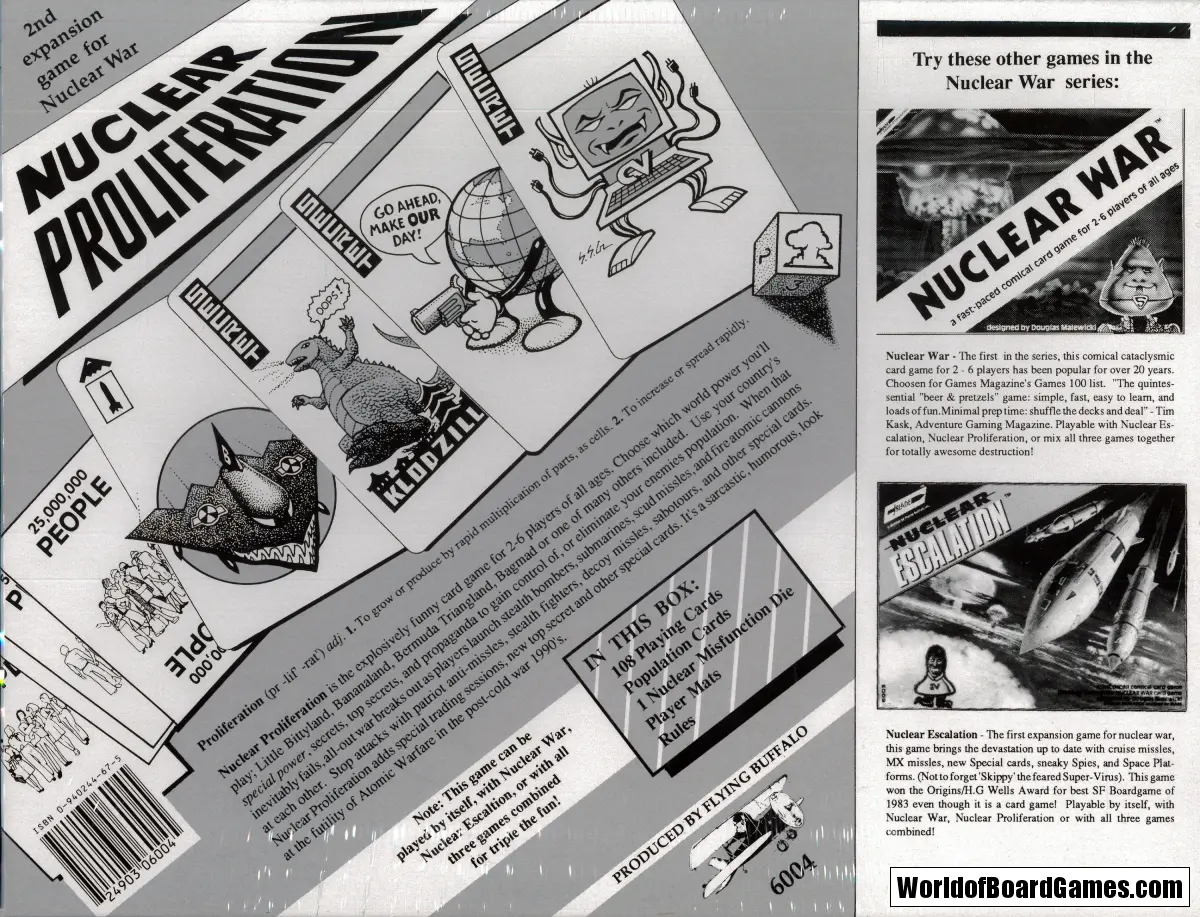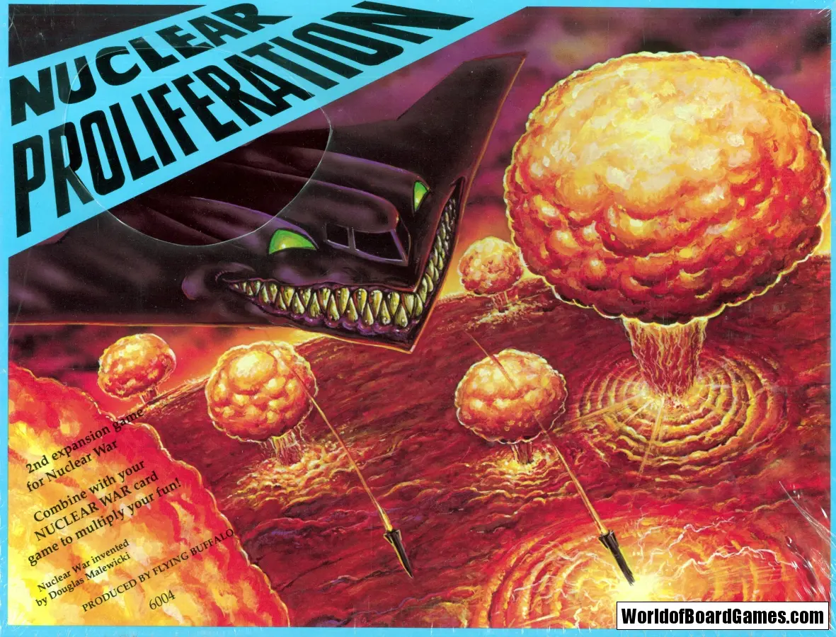 NUCLEAR PROLIFERATION: the second `expansion set' for Nuclear War, this explosively funny card game is for 2-6 players of all ages. Choose which world power you'll play: Little Bittyland, Bananaland, Bermuda Triabland, Bagmad, or one of many others included. Use your country's Special Power, secrets, top secrets, & propaganda to gain control of, or eliminate your enemy's population. When that inevitably fails, all-out war breaks out as players launch stealth bombers, submarines, scud missiles, and fire atomic cannons at each other. Stop attacks with patriot anti- missiles, stealth fighters, decoy missiles, saboteurs, and other special cards. Includes one of our special "Nuclear Misfunction" dice, which may glow in the dark if you get one of the lucky ones. Nuclear Proliferation adds special trading sessions, new top secret and other special cards. It's a sarcastic, humorous look at the futility of Atomic Warfare in the post-cold war 1990's,