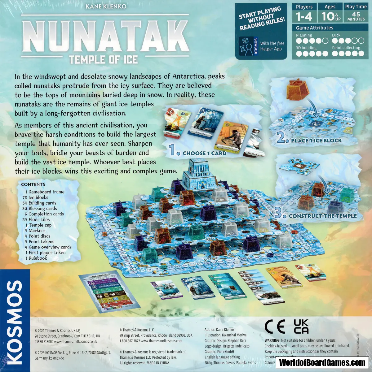 In the windswept and desolate snowy landscapes of Antarctica, peaks called nunataks protrude from the icy surface. They are believed to be the tops of mountains buried deep in snow. In reality, these nunataks are the remains of giant ice temples built by a long-forgotten civilization. As members of this ancient civilization, you brave the harsh conditions to build the largest temple that humanity has ever seen. Sharpen your tools, bridle draft animals, and build the vast ice temple. Whoever places their ice blocks in the most strategic – and lucky – positions, wins this exciting and complex three-dimensional construction game. Gameplay: 1. Choose a card. 2. Place 1 ice block. 3. If you can, add a layer to the temple