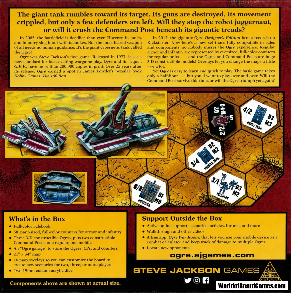 The Sixth Edition is the first widely-available release of this classic wargame since 2000. Published originally in 1977, Ogre set a new standard for fast, exciting wargaming. Ogre and its sequel, G.E.V. , have more than 200,000 copies in print. Over 25 years after its release, Ogre earned a spot in James Lowder's popular book Hobby Games: The 100 Best.