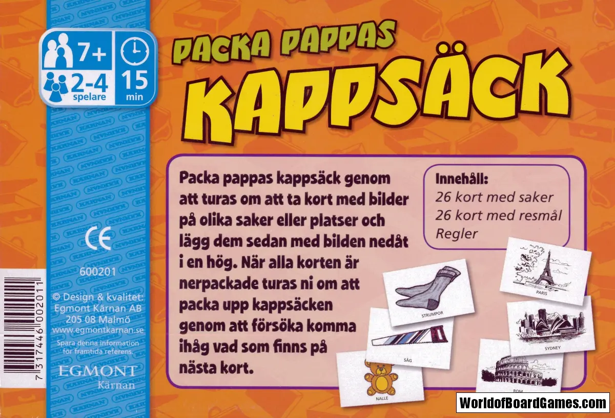 Packa pappas kappsäck genom att turas om att ta kort med bilder på olika saker eller platser och lägg dem sedan med bilden nedåt i en hög. Försök att komma ihåg i vilken ordning de ligger. Den som säger rätt vinner kortet.