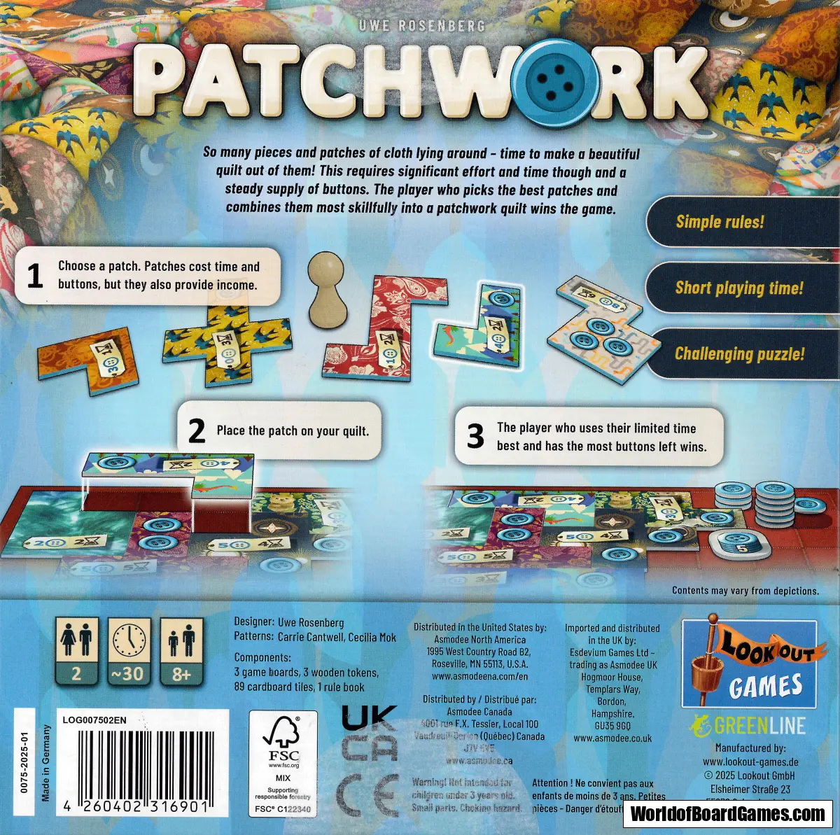 De två spelarna har varsitt lapptäcke framför sig och ett tjog med tygbitar att välja mellan för att försöka lappa ihop täcket så bra som möjligt! Men har du knappar nog för att kunna sätta fast den tygbit som du vill ha?