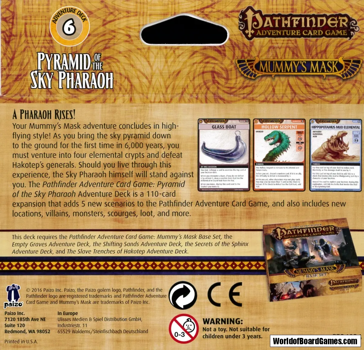Your Mummy's Mask adventure concludes in high-flying style! As you bring the sky pyramid down to the ground for the first time in 6,000 years, you must venture into four elemental crypts and defeat Hakotep's generals. Should you live through this experience, the Sky Pharaoh himself will stand against you. The Pathfinder Adventure Card Game: Pyramid of the Sky Pharaoh Adventure Deck is a 110-card expansion that adds 5 new scenarios to the Pathfinder Adventure Card Game, and also includes new locations, villains, monsters, scourges, loot, and more.