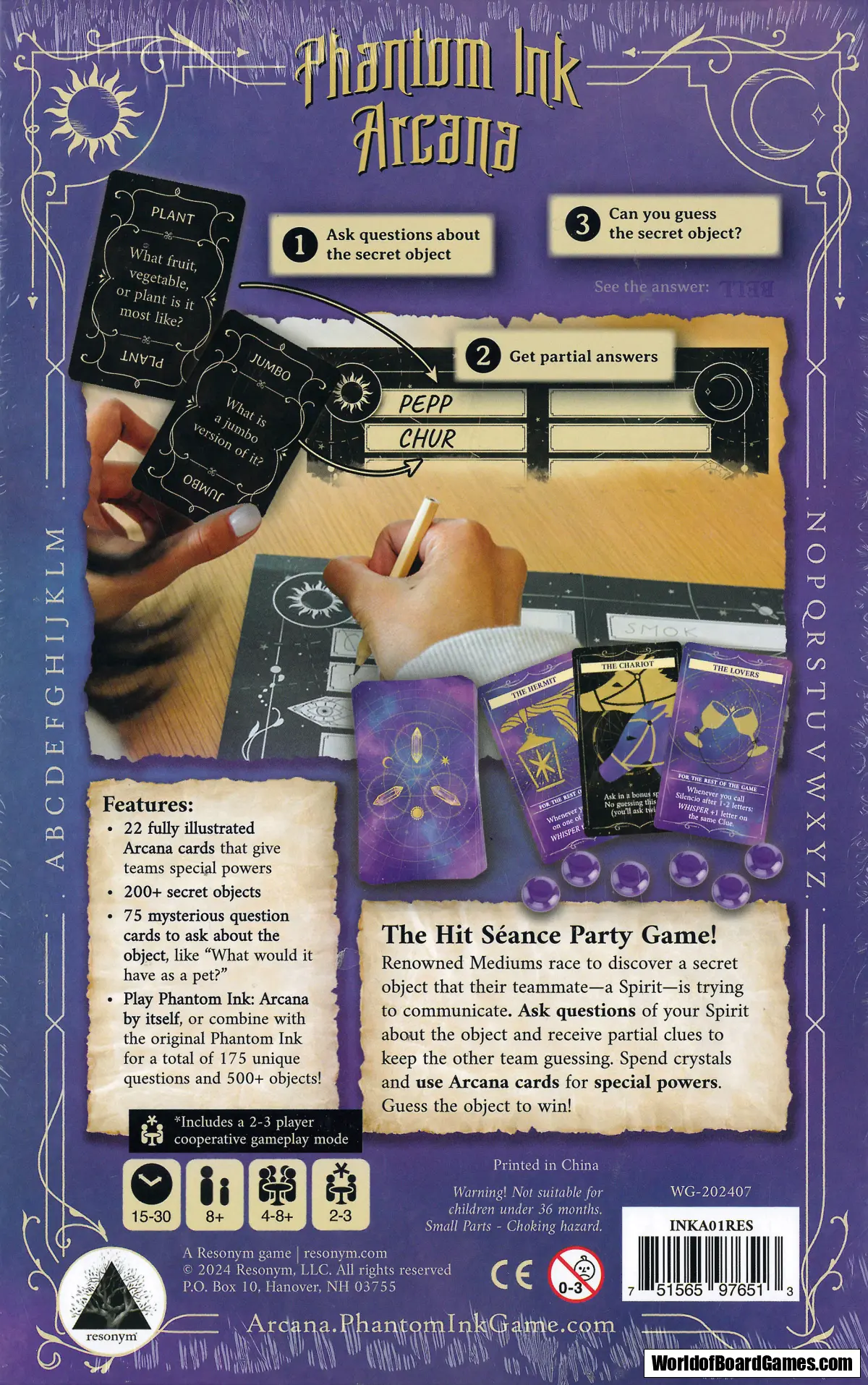 Phantom Ink: Arcana is a standalone expansion to Phantom Ink! Phantom Ink: Arcana adds 22 fully illustrated tarot cards to the game, each with special abilities to help their team get more information about the secret object. It also includes over 200 new objects, and 75 completely new question cards like “What’s a jumbo version of it?” and “What might it have as a pet?”