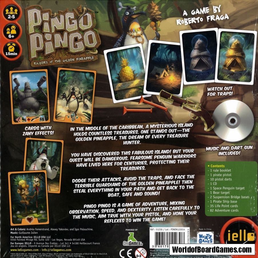 IELLO's Pingo Pingo is an exciting action game by Roberto Fraga for 2 to 5 players where everyone is searching for the Golden Pineapple while trying to avoid the warrior penguins (and reacting to the real-time soundtrack!).