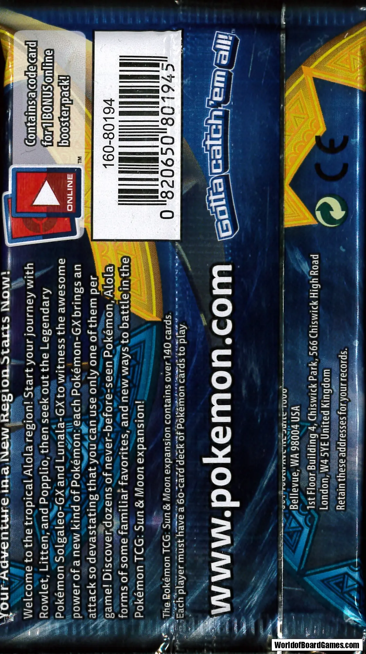 The battles heat up with Pokémon from the tropical Alola region in the Pokémon Trading Card Game: Sun & Moon expansion. Start your journey with Rowlet, Litten, and Popplio, then seek out the Legendary Pokémon Solgaleo-GX and Lunala-GX to witness the awesome power of a new kind of Pokémon: each Pokémon-GX brings an attack so devastating that you can use only one of them per game. Discover dozens of never-before-seen Pokémon, Alola forms of some familiar favorites, and new ways to battle in the Pokémon TCG: Sun & Moon expansion.