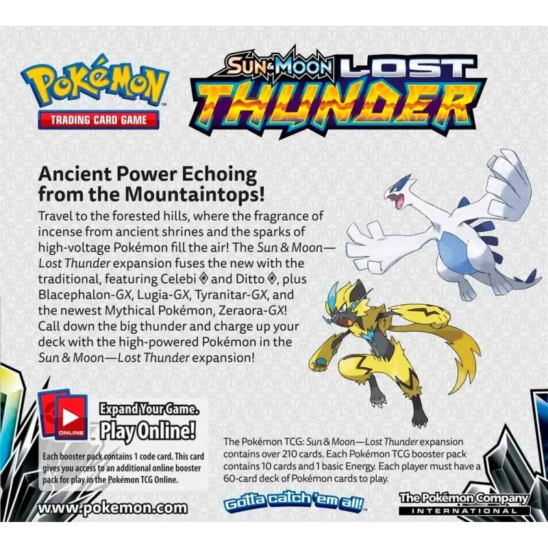 Ancient power and high-voltage sparks fill the air in the Pokémon TCG: Sun & Moon—Lost Thunder expansion! This massive expansion fuses the new with the traditional, featuring Celebi and Ditto , plus incredible Pokémon-GX like Blacephalon-GX, Lugia-GX, and Tyranitar-GX. Plus, discover the energetic might of the newest Mythical Pokémon, Zeraora-GX, in its Pokémon TCG debut. Call down the thunder and charge up your deck with scores of high-powered Pokémon in the Sun & Moon—Lost Thunder expansion!