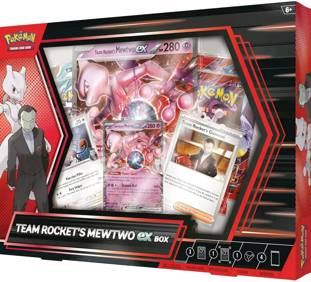 I jakten på ultimat makt och världsherravälde släpper Giovanni och Team Rocket lös en skrämmande stark Pokémon i strid! När Team Rockets Mewtwo ex får stöd från andra Team Rocket-Pokémon kan dess attack Erasure Ball göra upp till 280 skada i ett enda kraftfullt slag. I den här lådan hittar du detta mäktiga Pokémon ex som ett foliepromokort, tillsammans med Team Rockets Meowth och Team Rockets Giovanni – plus ett fotoklistermärke och ett gäng booster pack.
