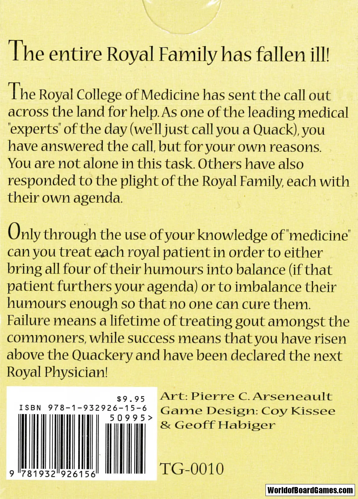 The Royal College of Medicine has sent the call out across the land for help. As one of the leading medical "experts" of the day (we'll just call you a Quack), you have answered the call, but for your own reasons. You are not alone in this task. Others have also responded to the plight of the Royal Family, each with their own agenda.