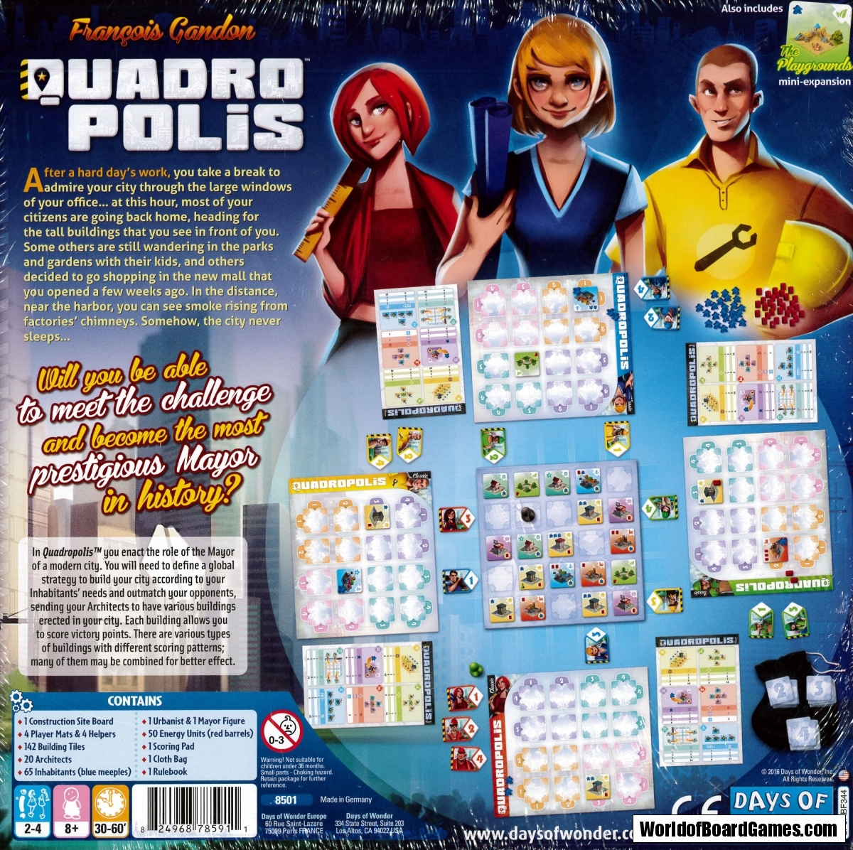 En park här, en fabrik där och en butik mitt i allting! Som borgmästare över sin helt egen stad får varje spelare i Quadropolis chansen att lägga upp stadens utformning som man själv vill, med målet att maximera antalet poäng som varje byggnadsbricka kommer att ge i slutet av spelomgången. Men de arkitekter som man har tillgängliga att konstruera byggnader med begränsar såväl vilka byggnader man kan plocka, som var någonstans i staden de går att placera ut!