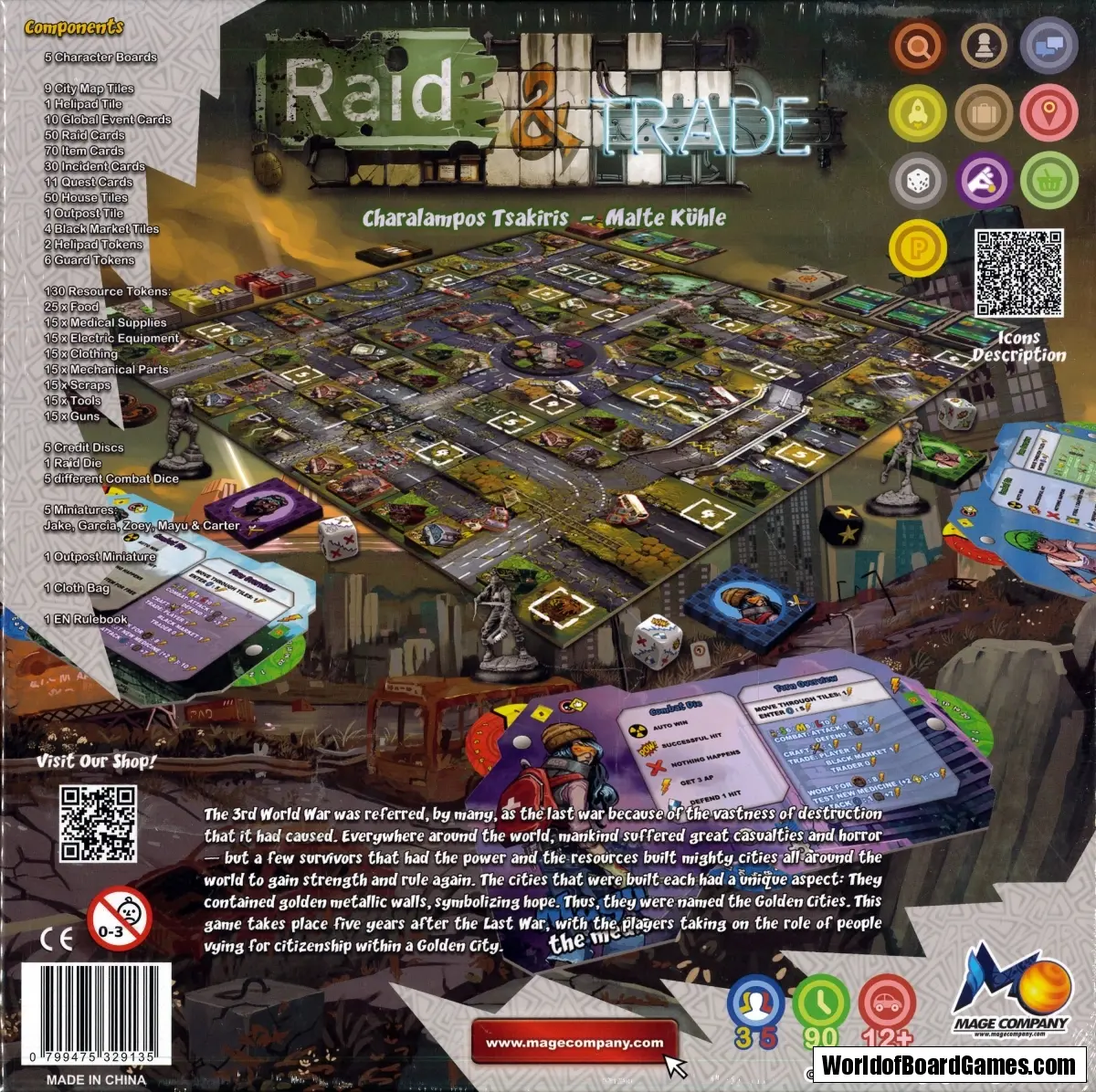 Raid & Trade is a post apocalyptic game of negotiation and resource management for 3-5 players. From the ashes of a devastating third World War, a precious few golden cities emerge offering hope to those who struggle for survival in the wastelands. Players explore the ruins of the modern world completing quests, honing their skills and maneuvering for social status in order to claim a precious spot as a citizen with a Golden City. To enter the golden city you must: