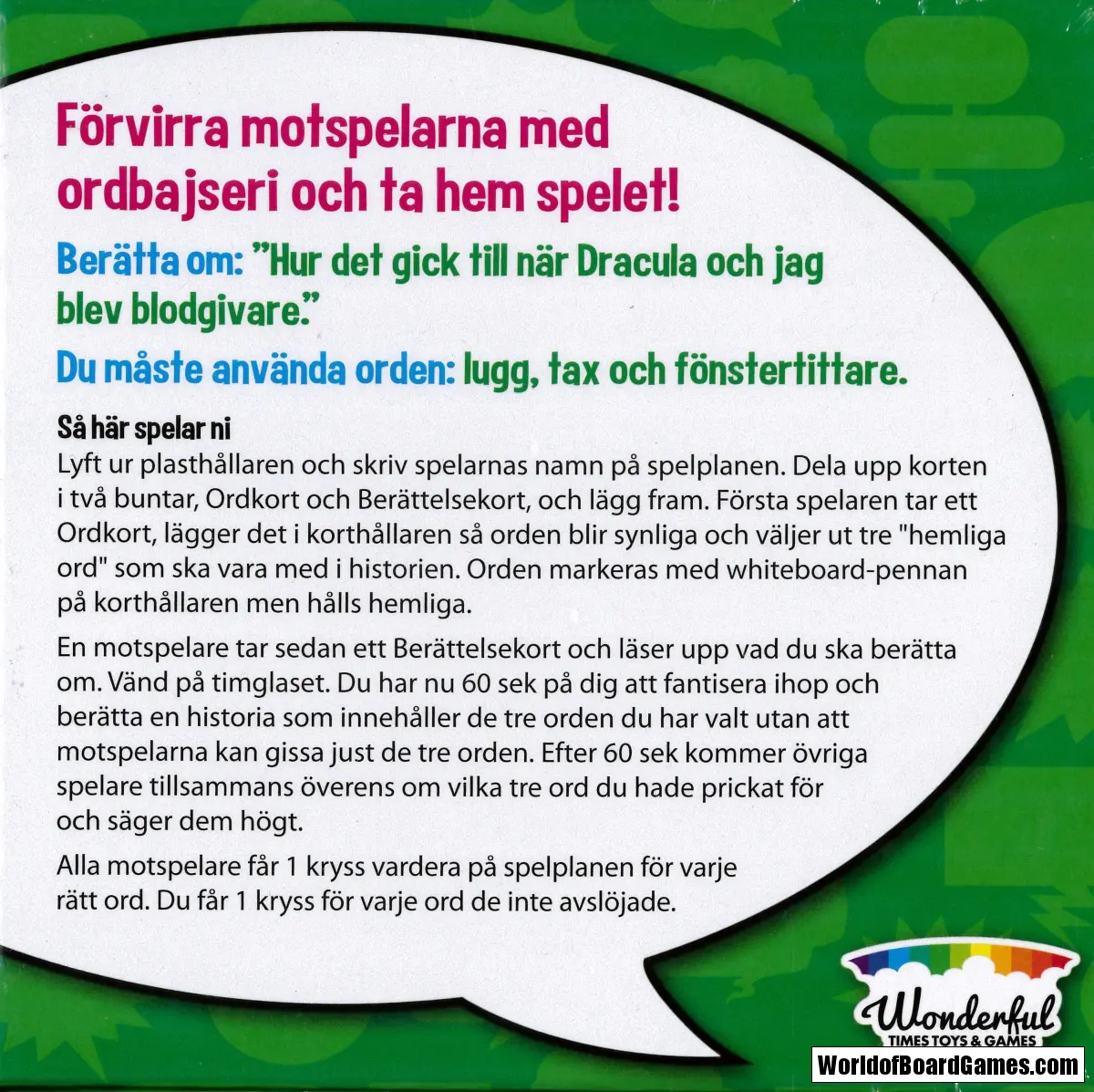 Förvirra motspelarna med dina otroliga historier och ta hem spelet! Du får välja ut tre ord och sen ska du skapa en trovärdig historia kring ett ämne där dessa ord är med. Dina medspelare ska försöka lista ut vilka ord som var hemliga!