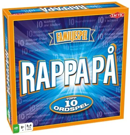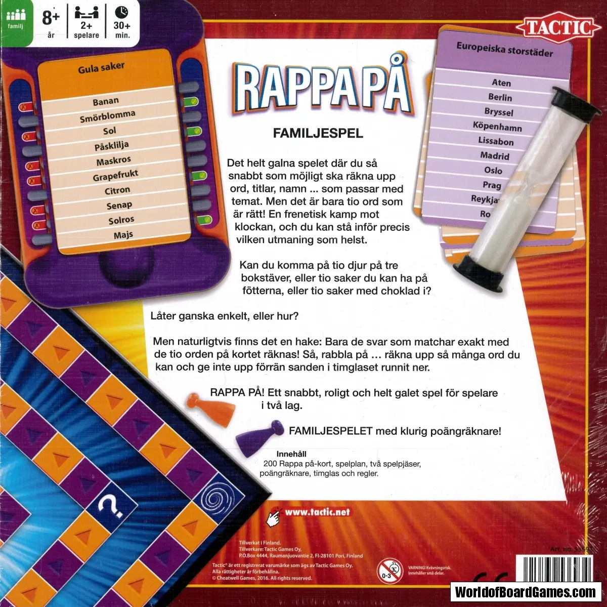 En kapplöpning mot tiden där du försöker att nämna tio saker som relaterar till ämnet på kortet. Endast de svar som stämmer exakt med kortet accepteras, så du måste tänka snabbt! Ämnena kan handla om allt från gröna grönsaker till något du inte bör göra. Spelet innehåller en korthållare som gör poängräkningen enklare. Spännande ordspel för två lag.