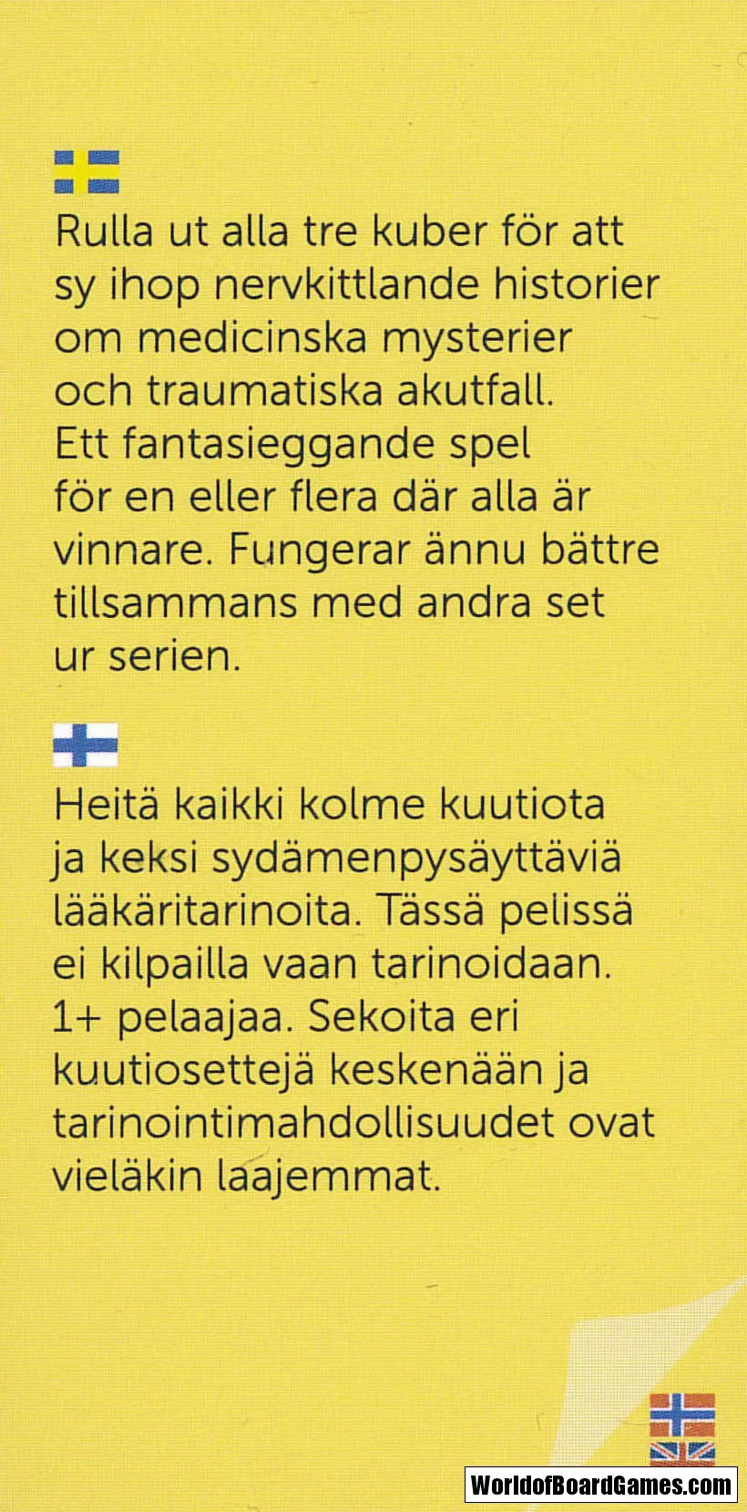 Rulla ut tärningarna och sy ihop nervkittlande historier om medicinska mysterier och traumatiska akutfall. Ett fantasieggande spel för en eller flera spelare där alla är vinnare. Fungerar ännu bättre tillsammans med andra set ur serien.