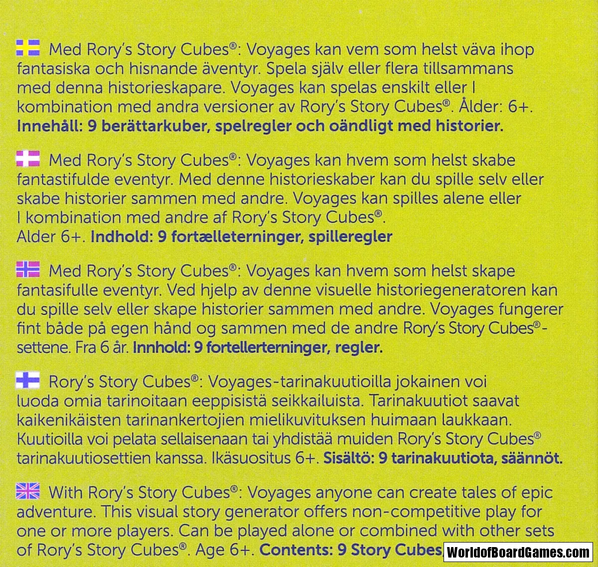 As with Rory's Story Cubes, you can play Voyages as a game for one or more players, as a party game for three or more, or as an improv game in which each player contributes part of the story, picking up where the last one left off. Win award points for speedy delivery, inventiveness, imagination, drama and humor.
