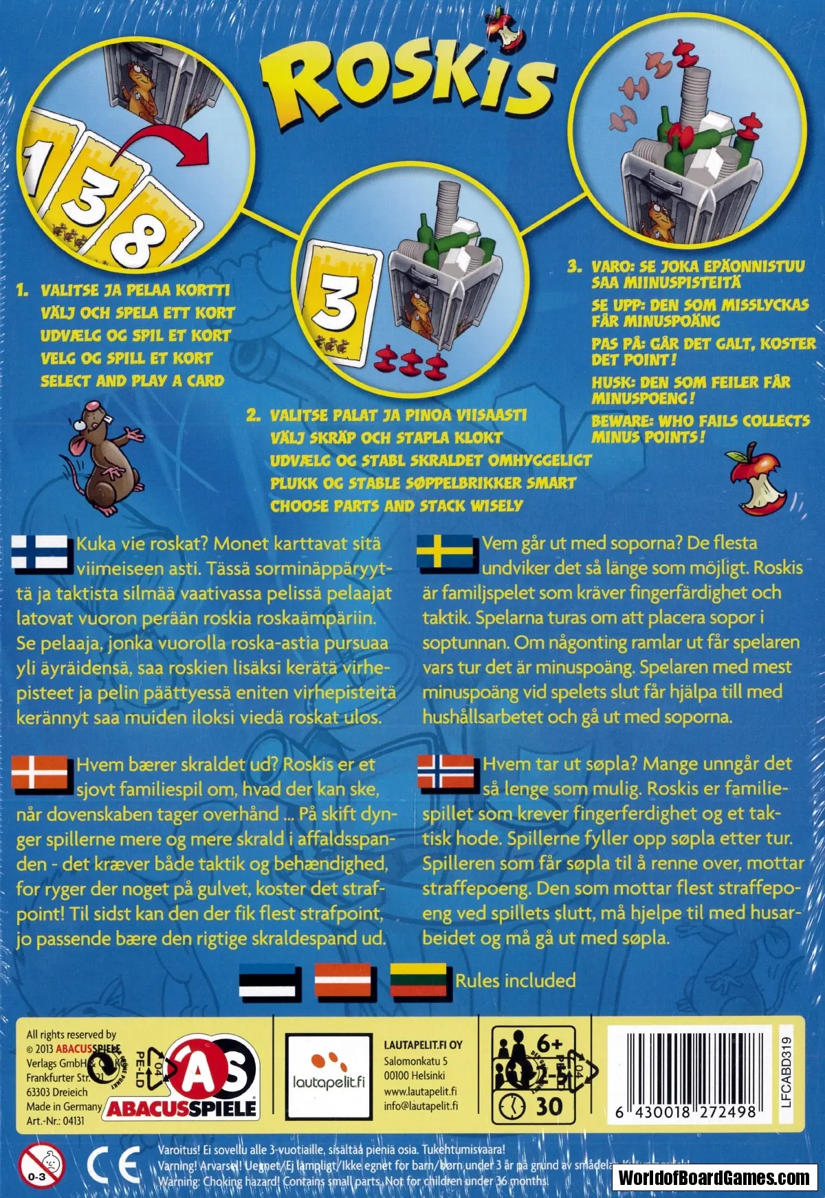Vem går ut med soporna? De flesta unviker det så länge det är möjligt. Roskis är familjespelet som kräver fingefärdighet och taktik. Spelarna turas om att placera sopor i soptunnan. Om någonting ramlar ut får spelaren vars tur det är minuspoäng. Spelaren med mest minuspoäng vid spelets slut får hjälpa till med hushållsarbetet och gå ut med soporna.