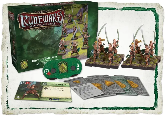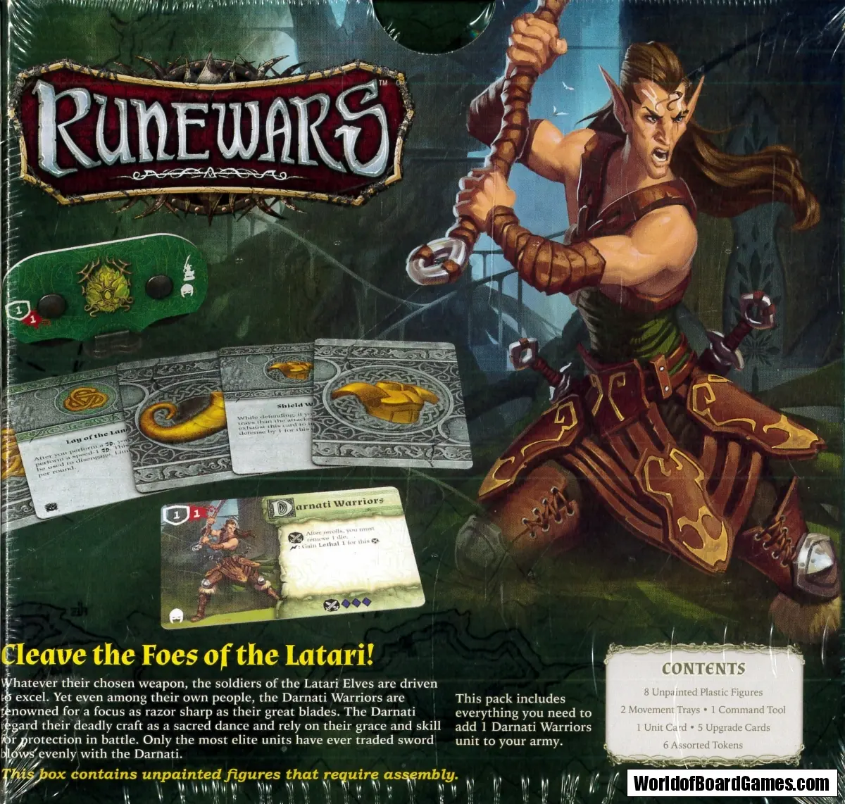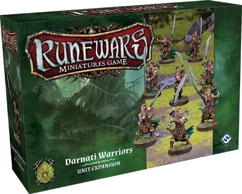 The Darnati Warriors Unit Expansion for Runewars Miniatures Game includes eight customizable, unpainted figurines and five upgrade cards to customize your elven army!