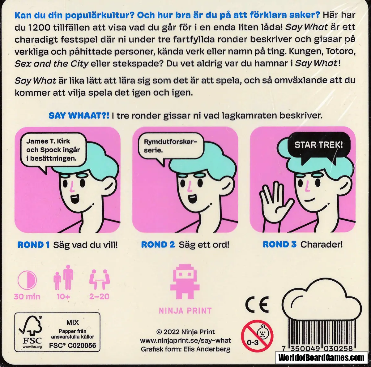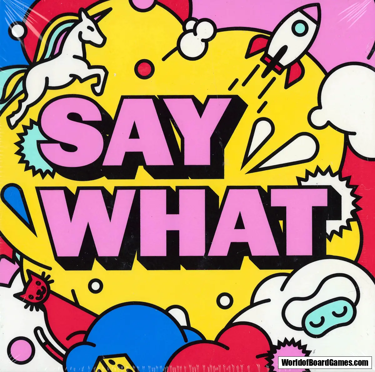 Say What är ett spel för festen eller kalaset, bjudningen eller släktträffen. Ett spel som erbjuder stor omväxling och kan spelas om och om igen. Det är lätt att lära sig, går snabbt att spela och passar ett stort åldersspann. I lådan trängs 640 fimer, böcker, serier, karaktärer, prylar och verkliga personer tillsammans med specialdesignad tärning och timglas.