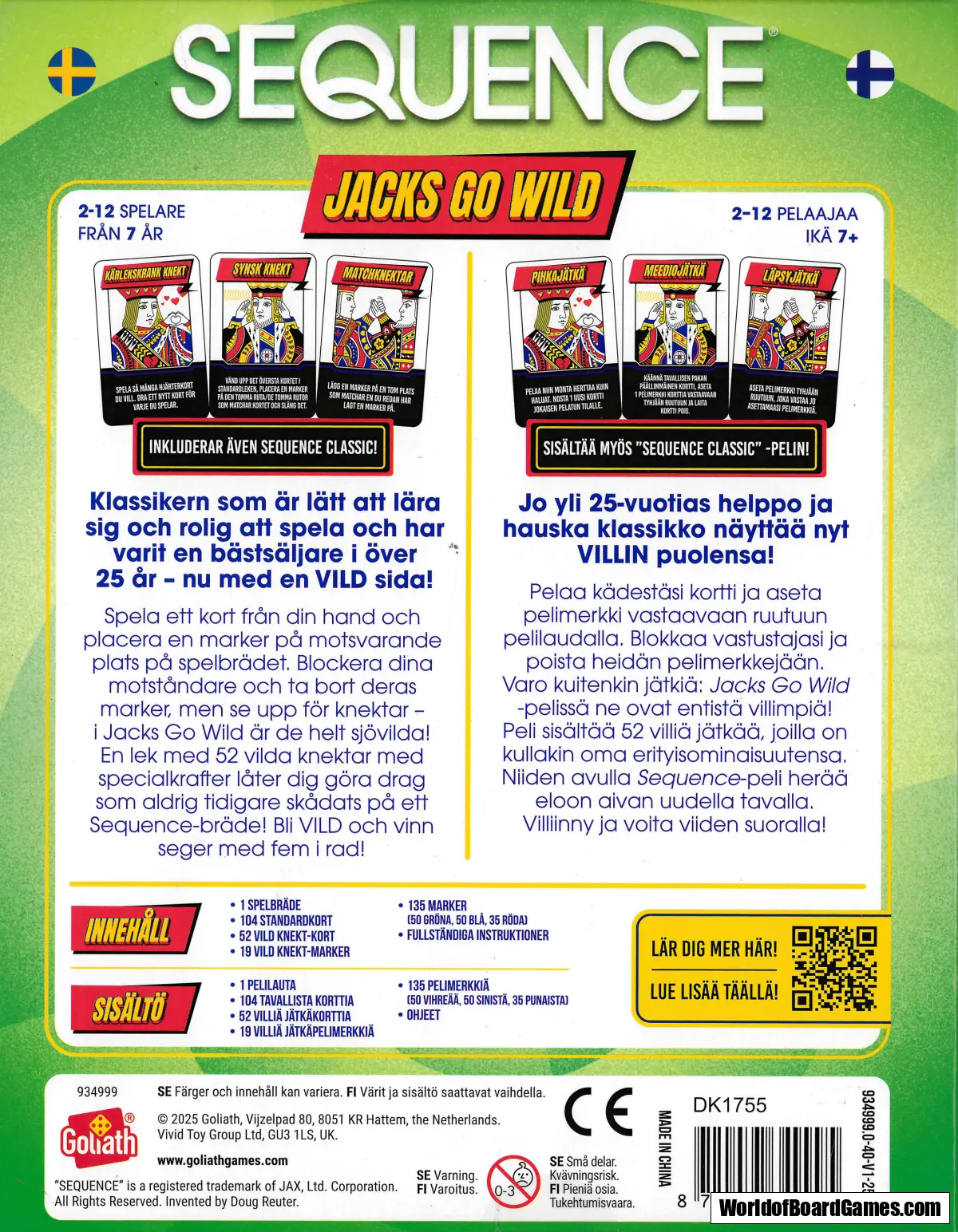 Spela ett kort från din hand och placera en marker på motsvarande plats på spelbrädet. Blockera dina motståndare och ta bort deras marker, men se upp för knektar - i Jacks Go Wild är de helt sjövilda! En lek med 52 vilda knektar med specialkrafter låter dig göra drag som aldrig tidigare skådats på ett Sequence-bräde!